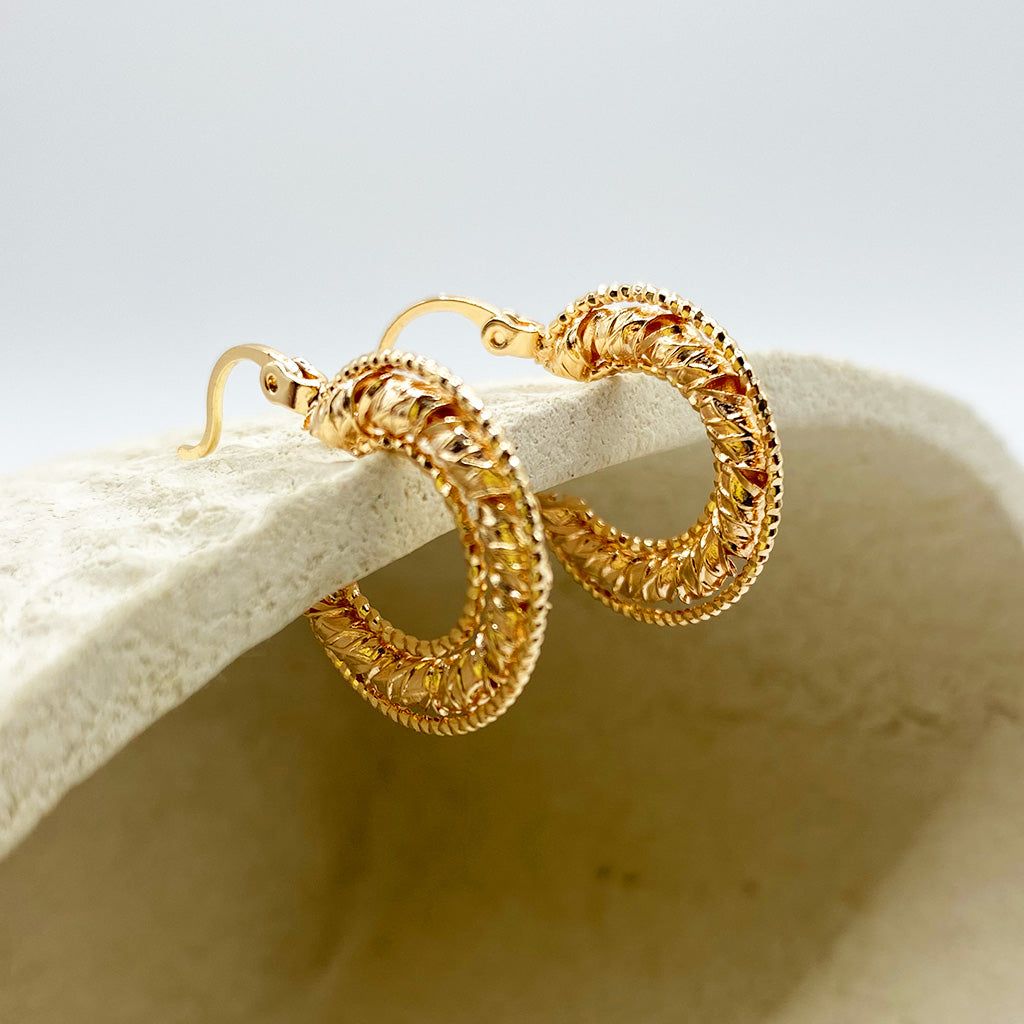 Arracada chapa de oro 18k, 2 cm de diámetro, estilo barroco trenzado.