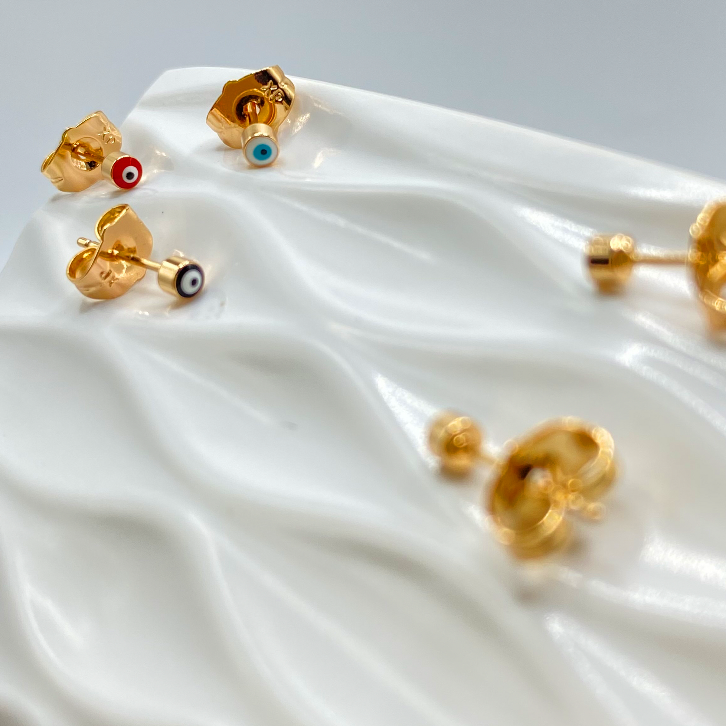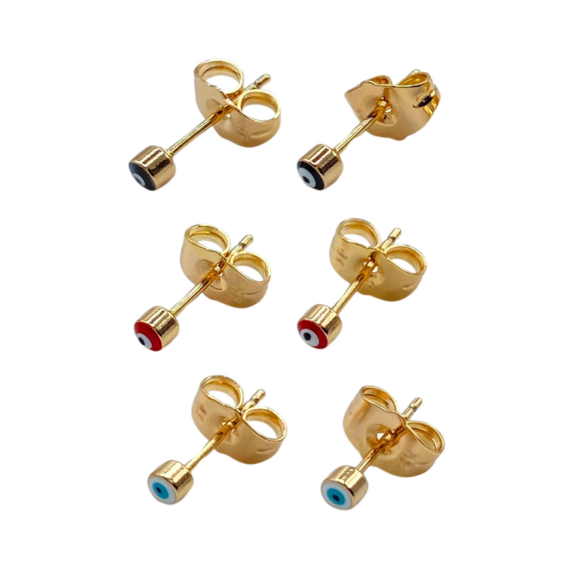 3 pares de arete en chapa de oro de 18k con diseños de ojo turco en rojo, blanco y azul.