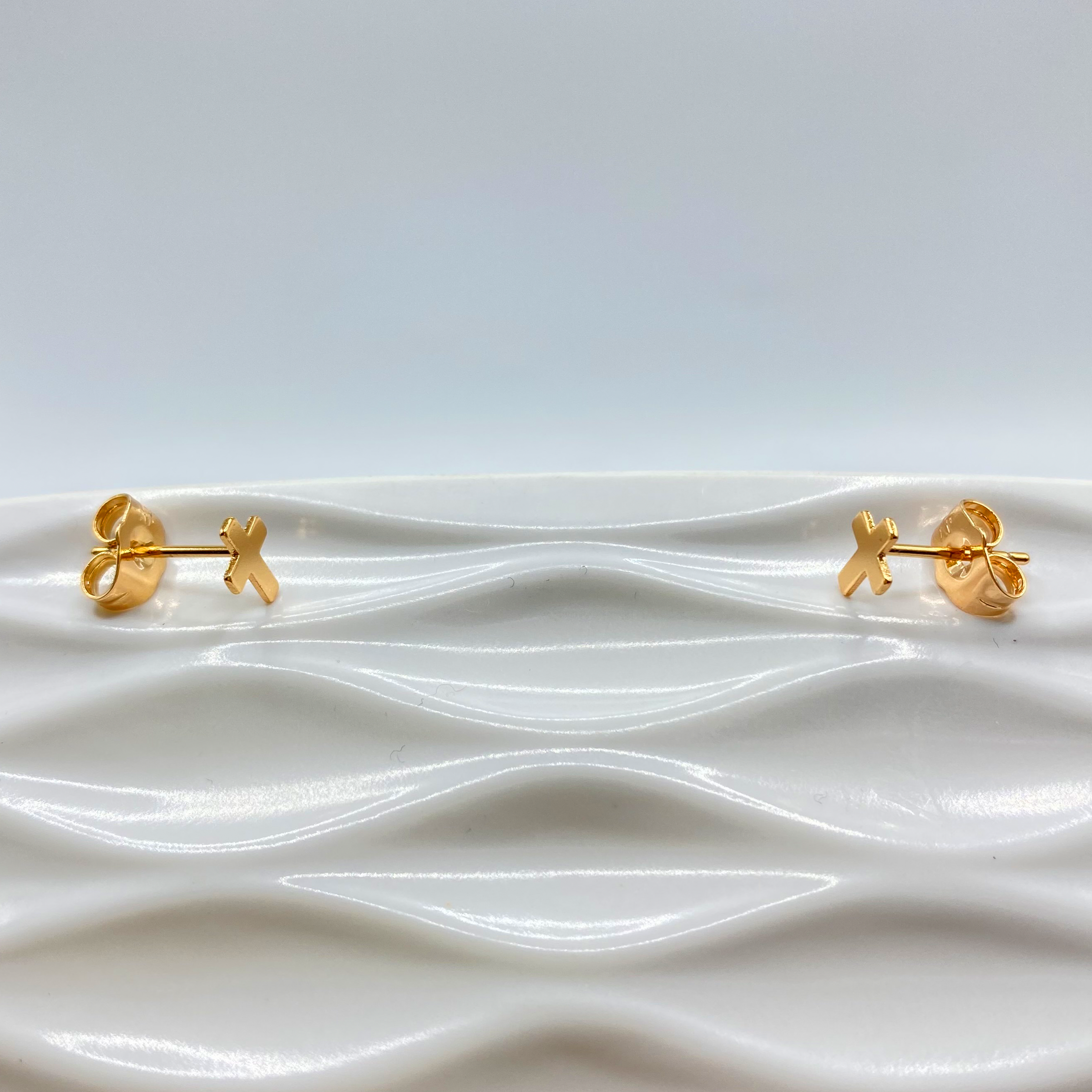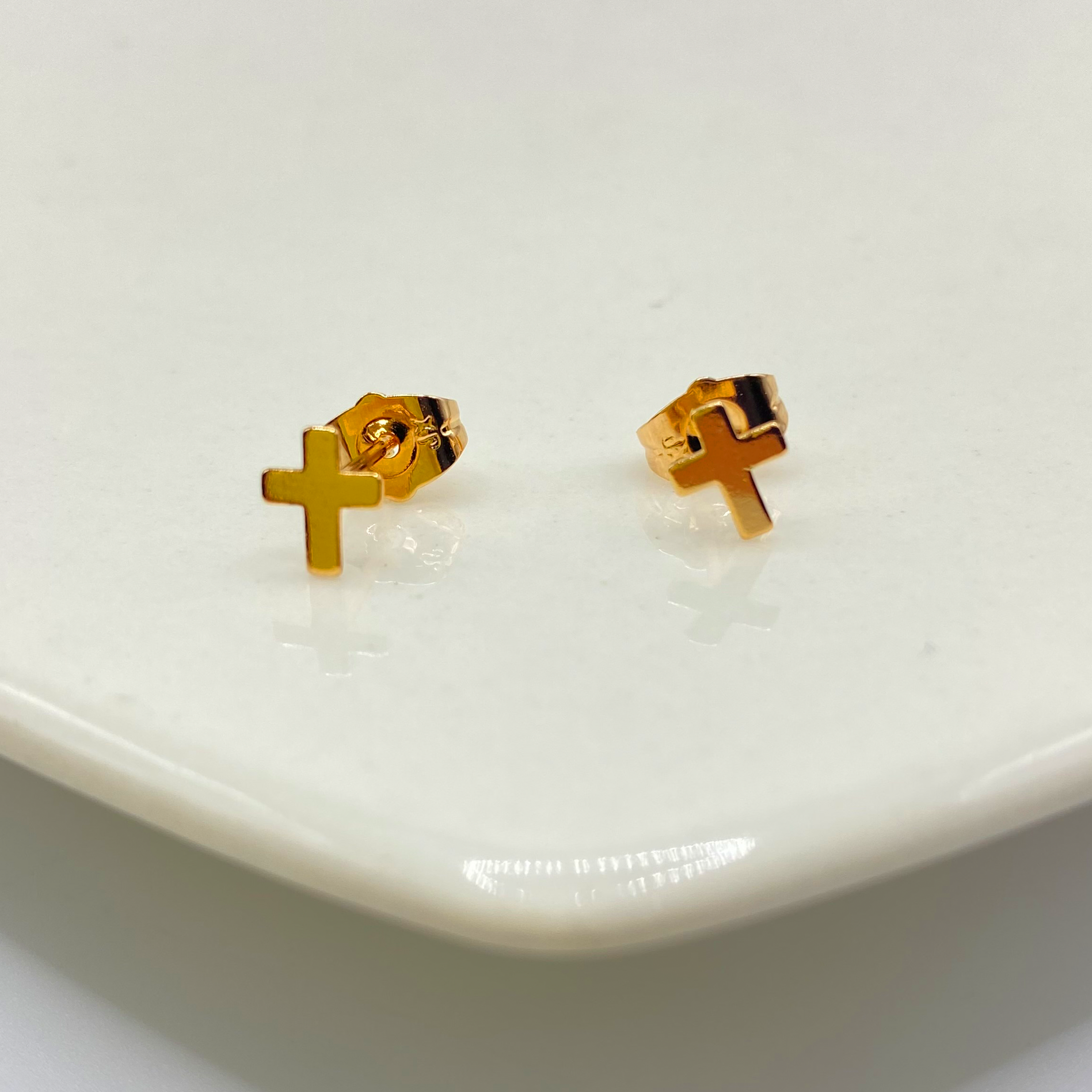 Arete broquel básico bañado en oro de 18k con diseño de cruz.