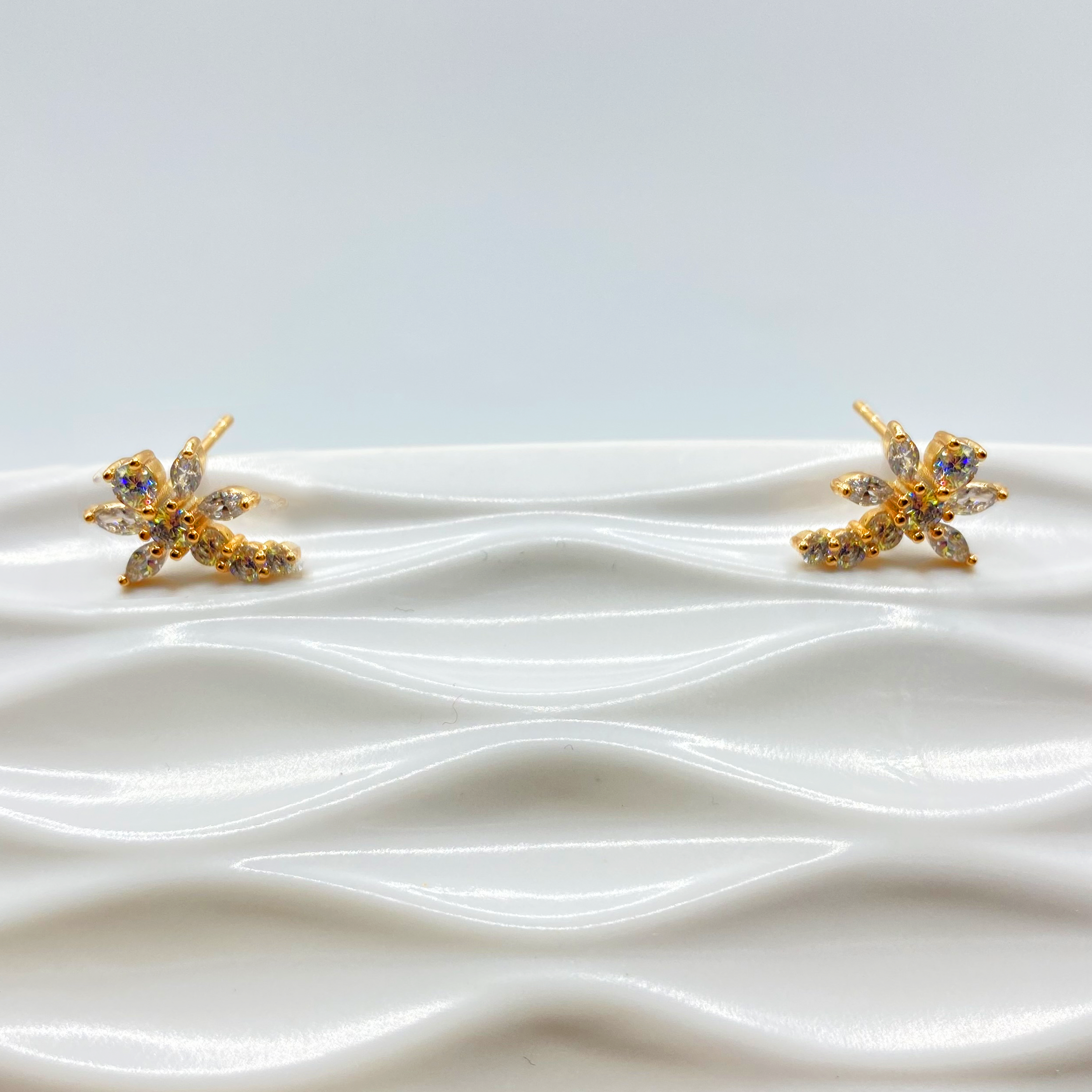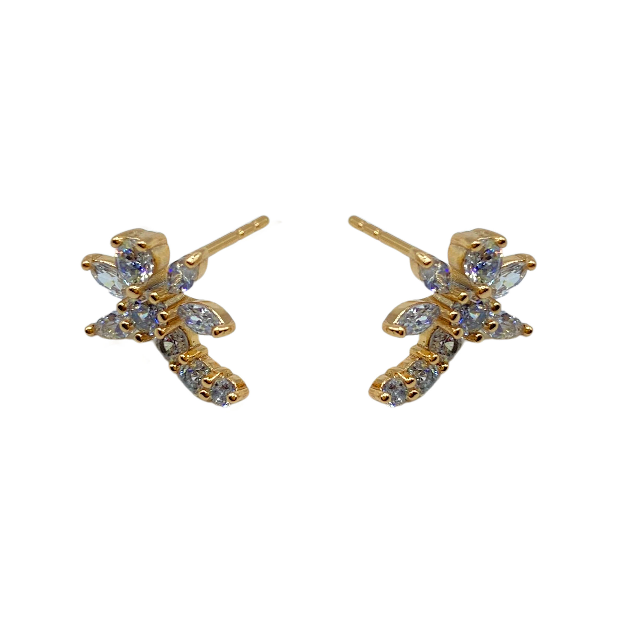 Arete broquel bañado en oro de 18k, en forma de libélula con circonias.