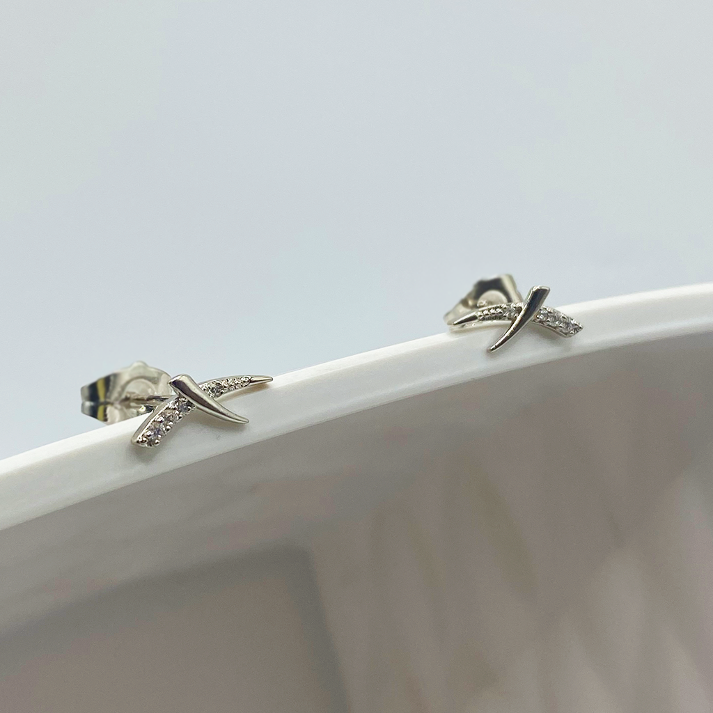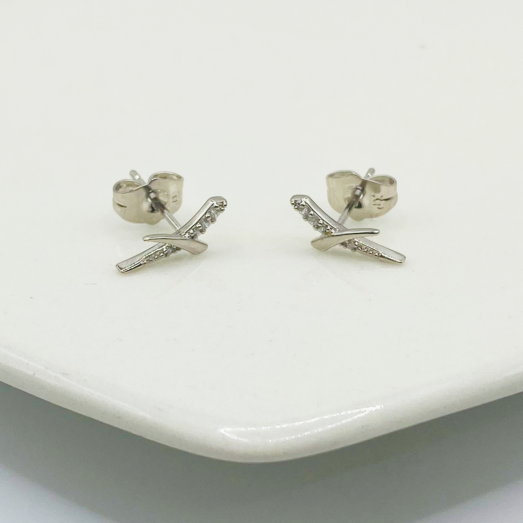 Arete broquel plateado con un diseño cruzado con circonias incrustradas.