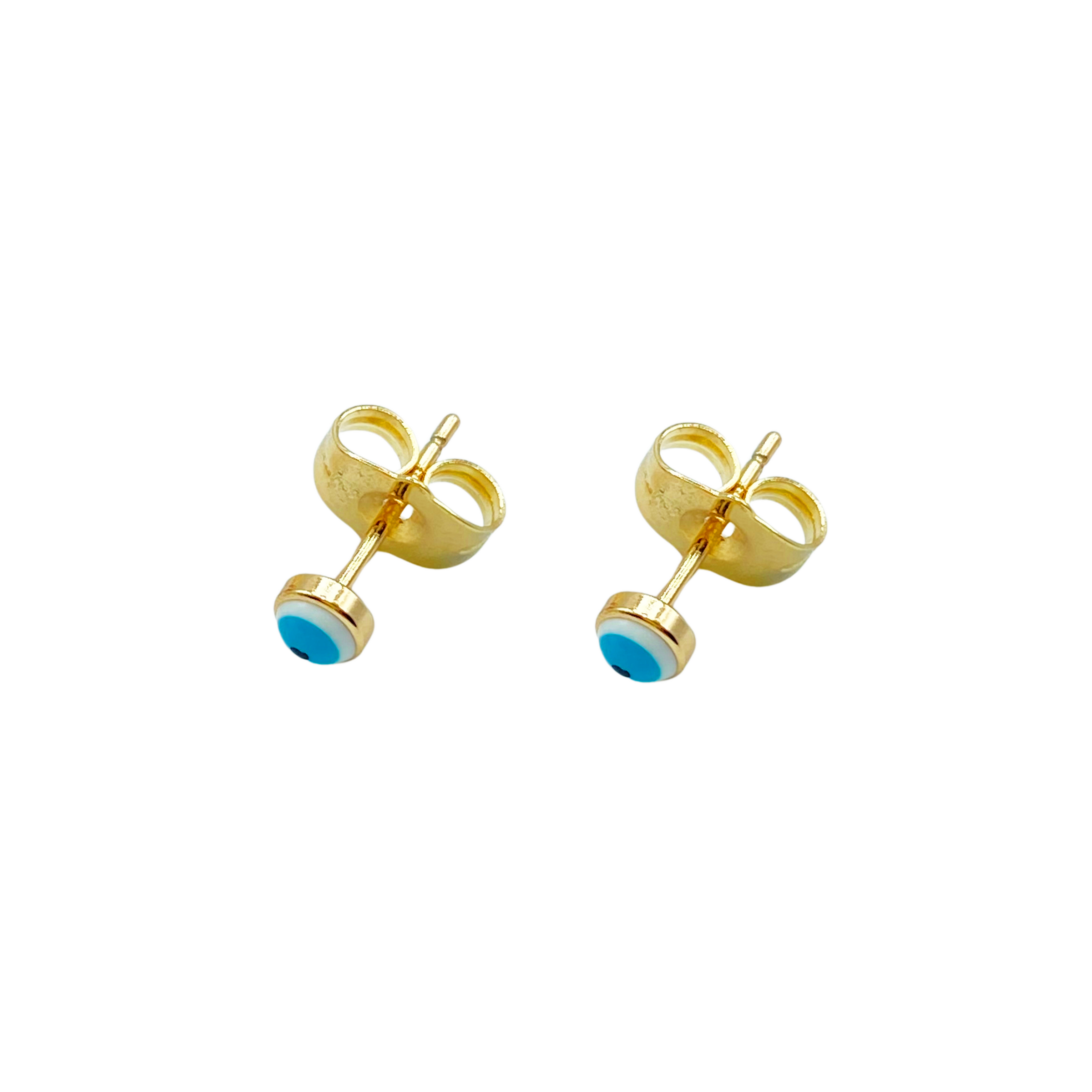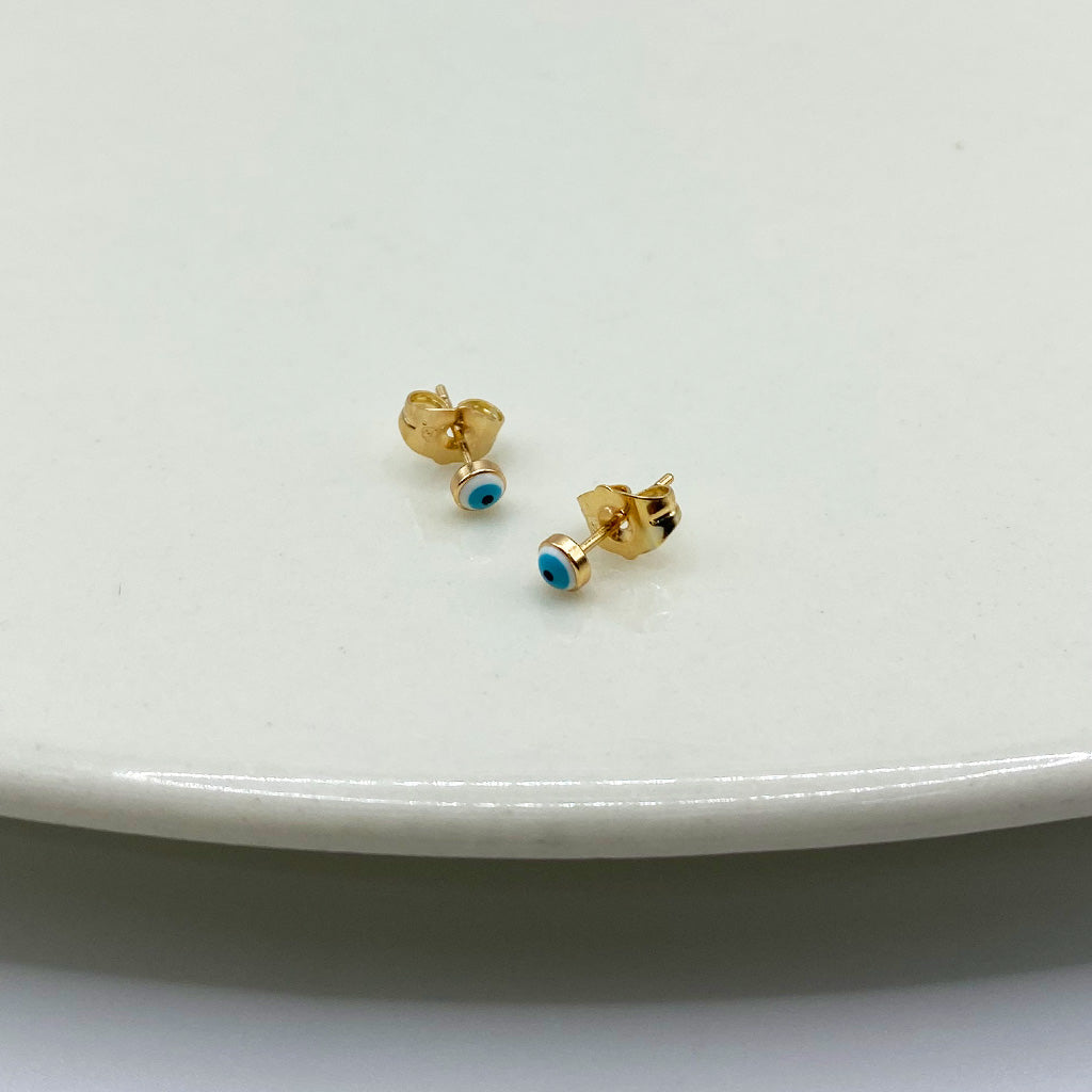 Arete broquel, chapa de oro 18k, diseño ojo turco redondo en colores azul con blanco.