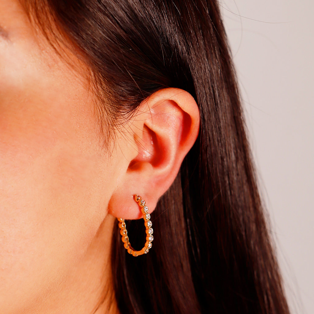 Huggie en chapa de oro 18k, 2 cm de largo, mitad lisa y mitad con zirconias.
