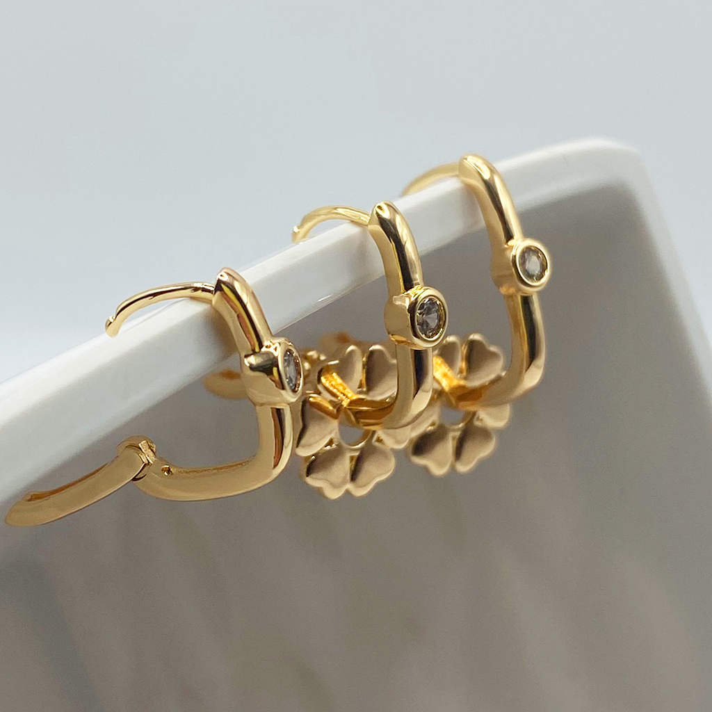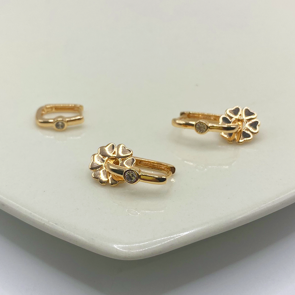 Set de aretes que incluye un aro dorado con un delicado diseño de flor y otro clásico con un destello de cristal.