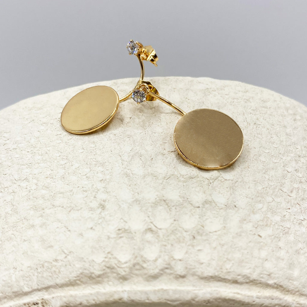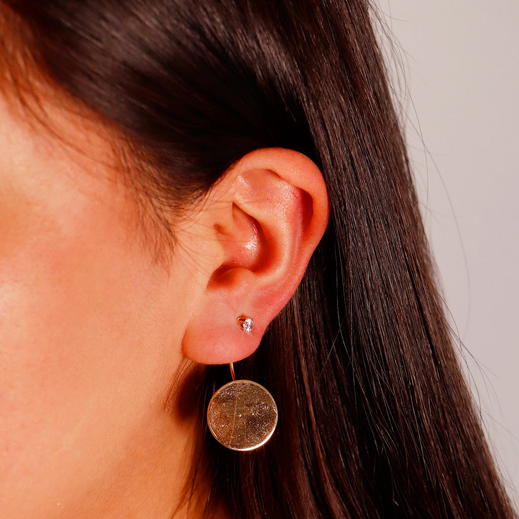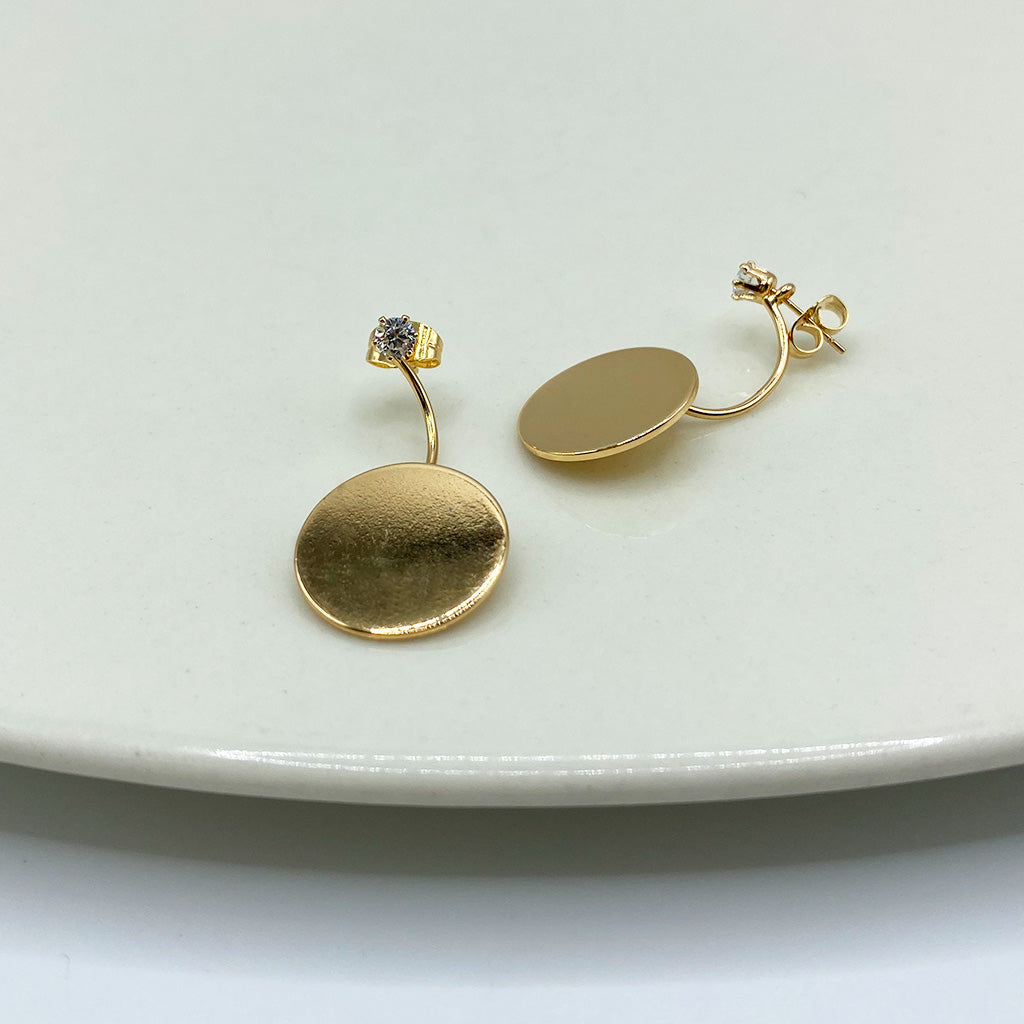 Arete largo en chapa de oro 18k, con diseño circular y broquel con zirconia, 3.5 cm de largo.