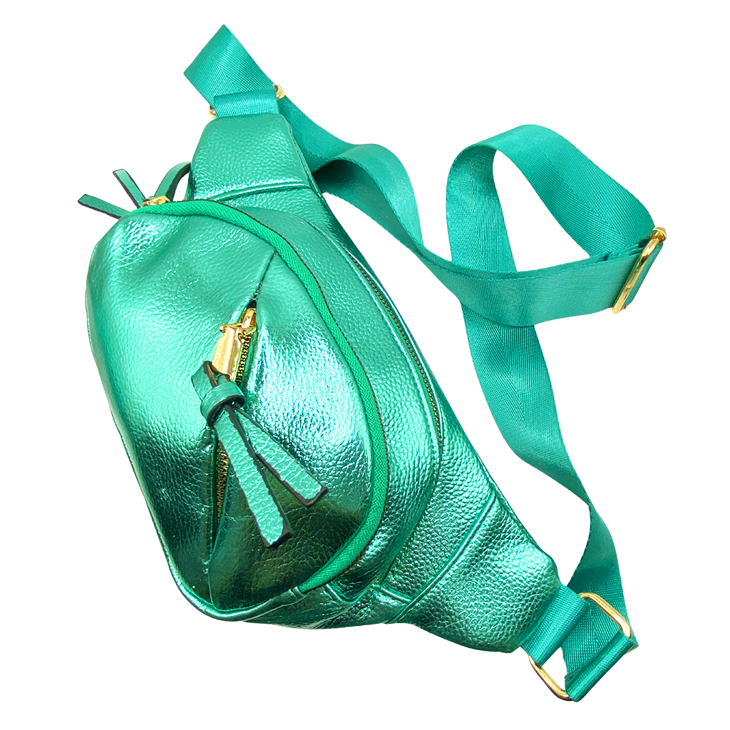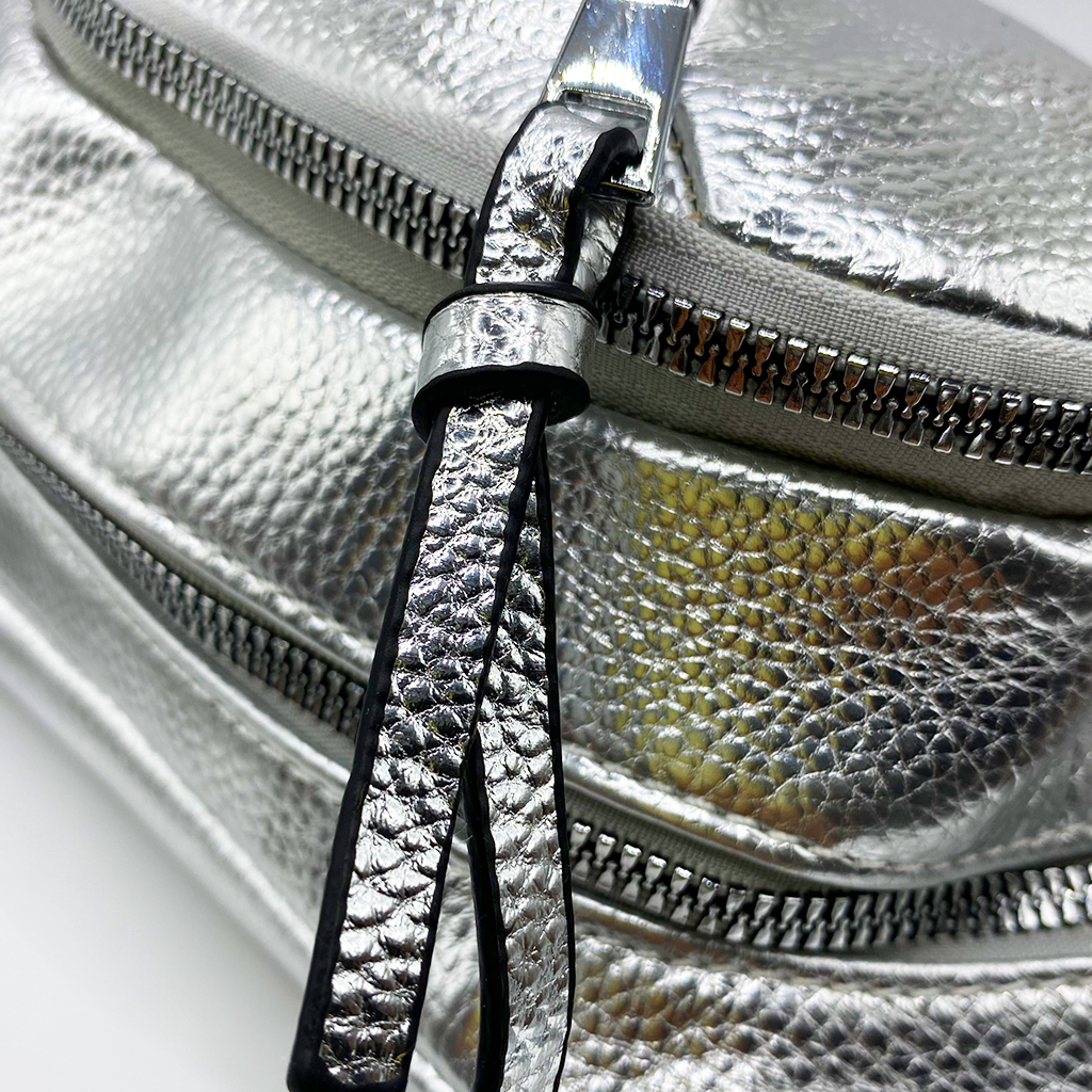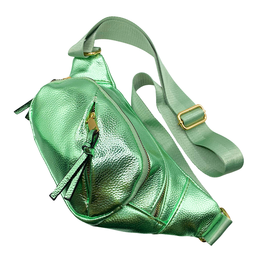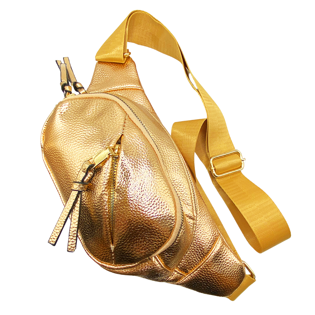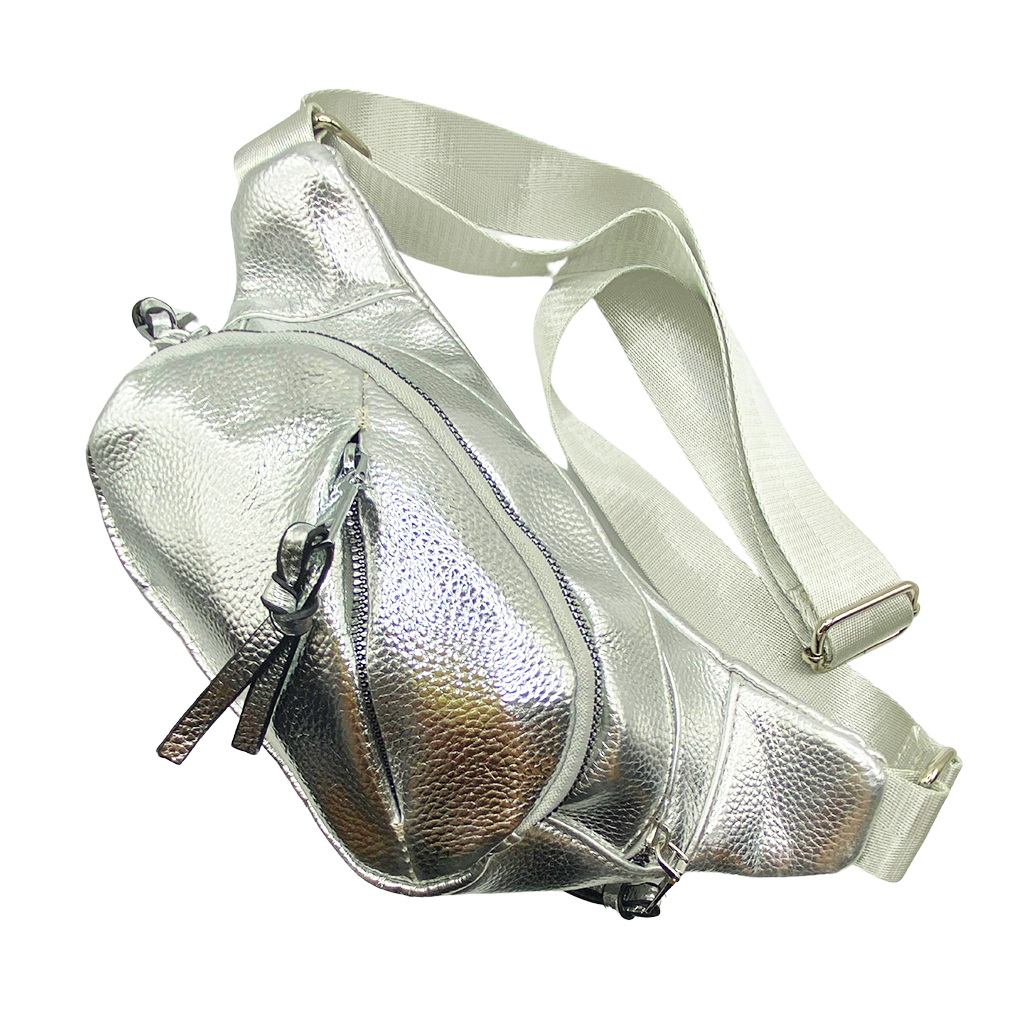 Cangurera en tonos metálicos. Este modelo está confeccionado con materiales de la más alta calidad y trae consigo una correa ajustable para mayor comodidad, ideal para tus salidas más casuales. Dimensiones: 20 cm de alto x 35 cm de ancho.