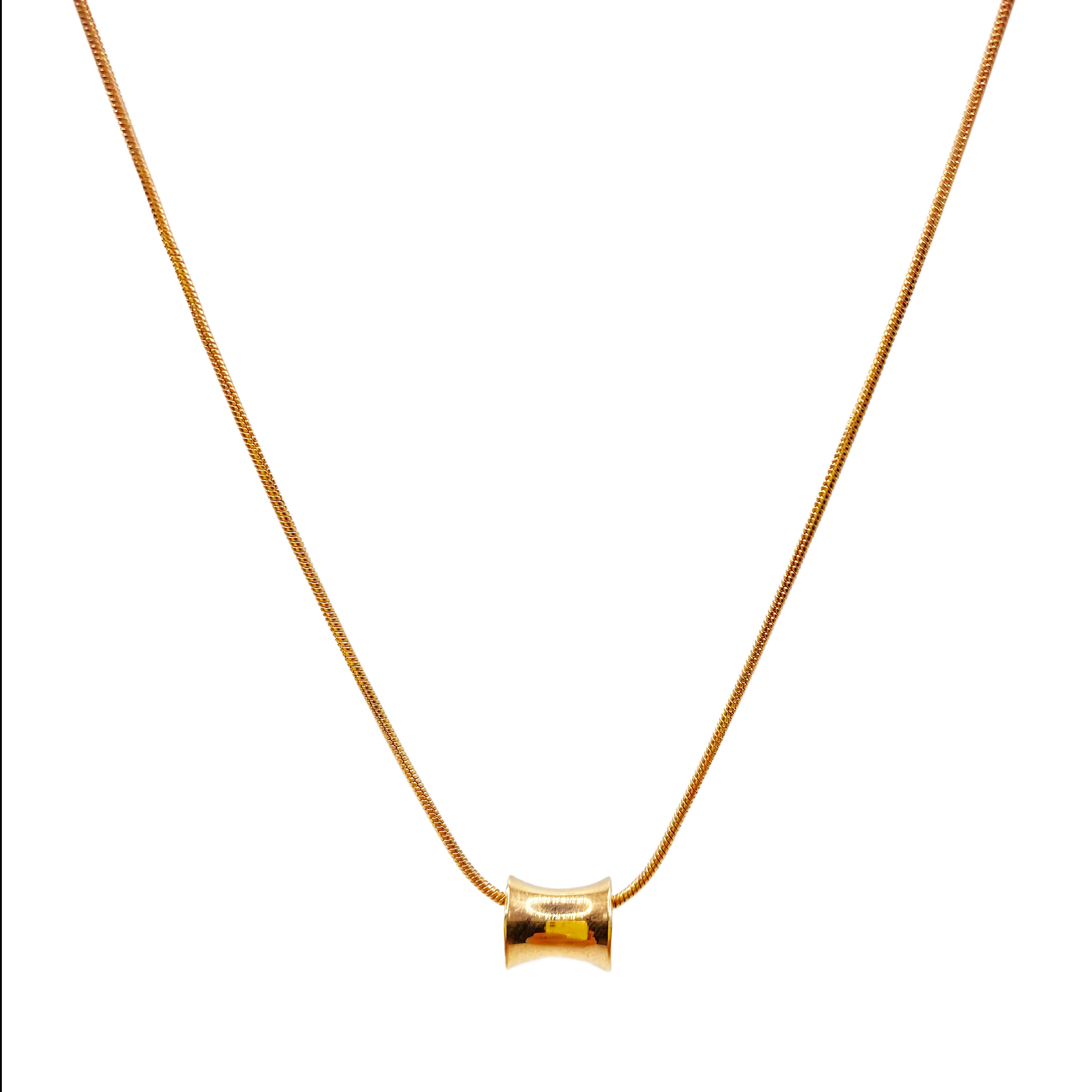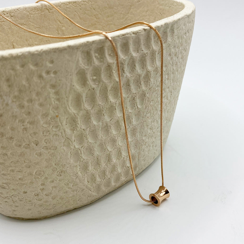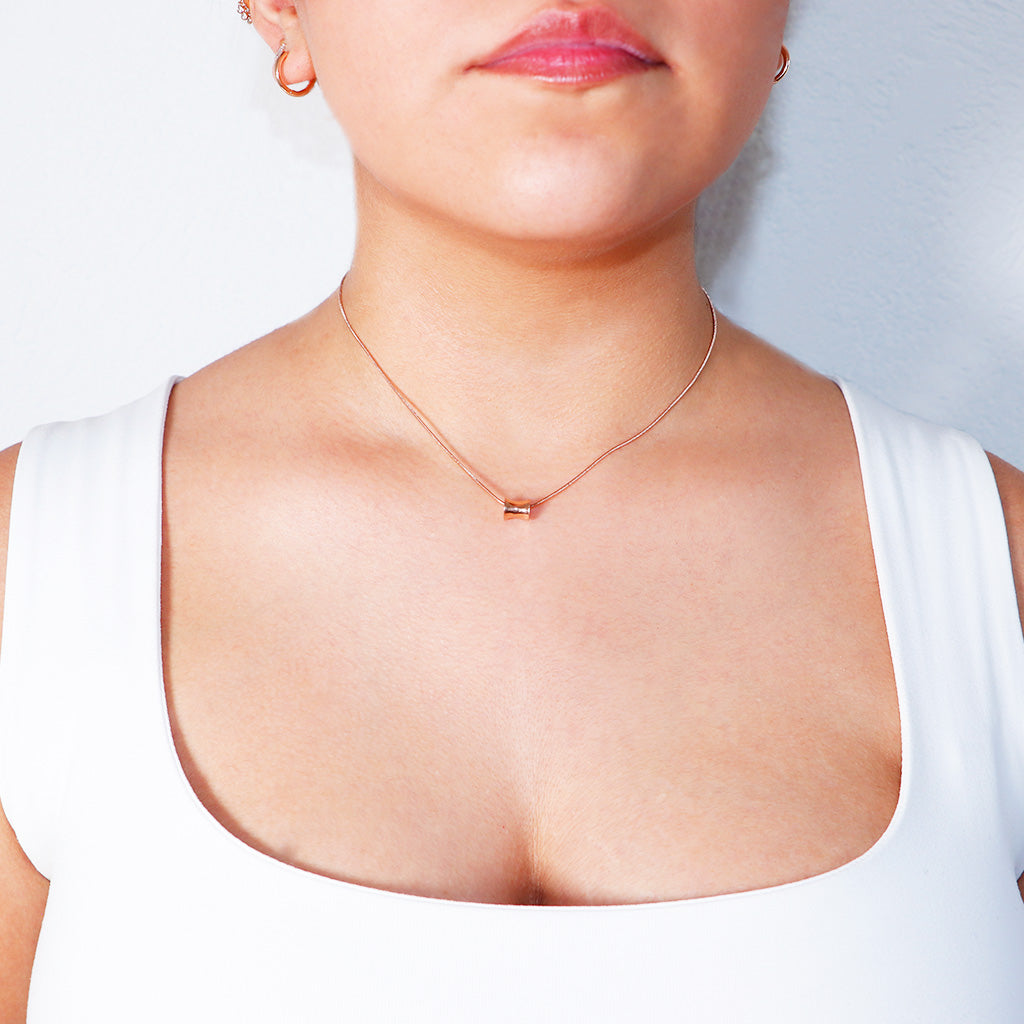Gargantilla de acero rosado, 40 cm de largo y extensión de 5 cm, con dije de cilndro.