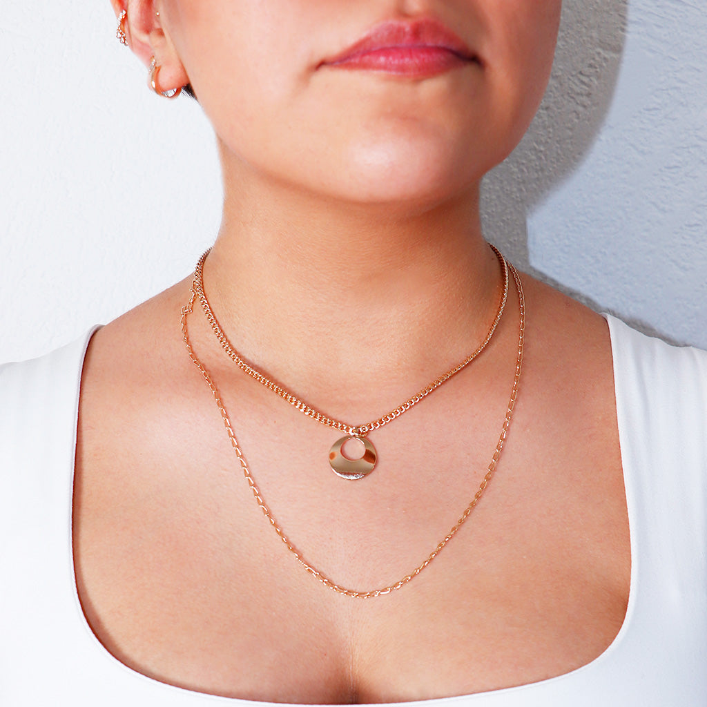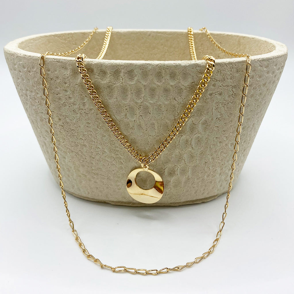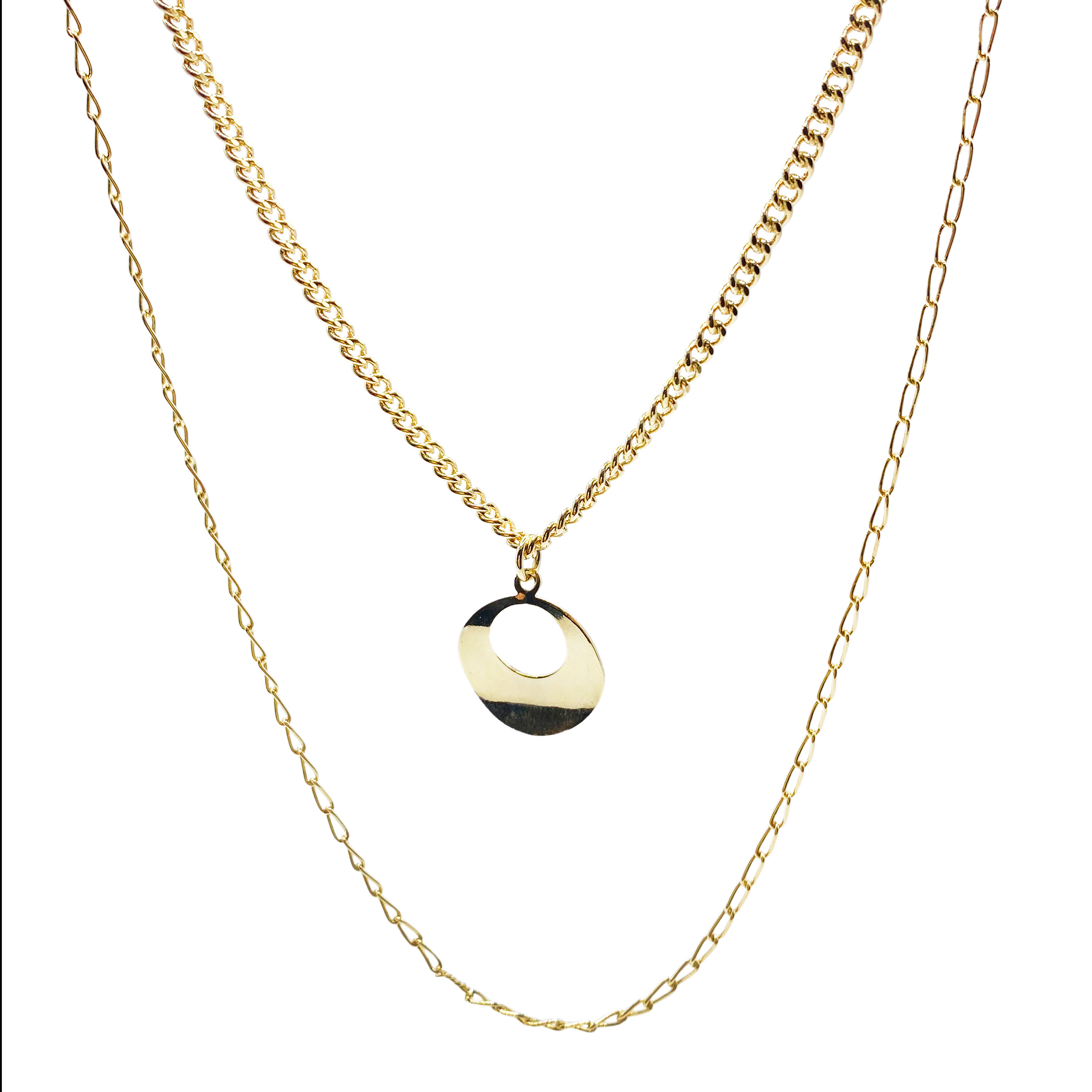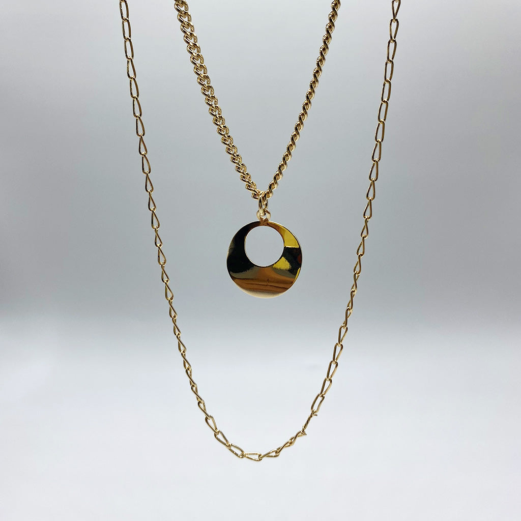 Gargantilla doble (45 cm y 55 cm) en chapa de oro de 18k con extensión de 5 cm y dije circular con perforación.