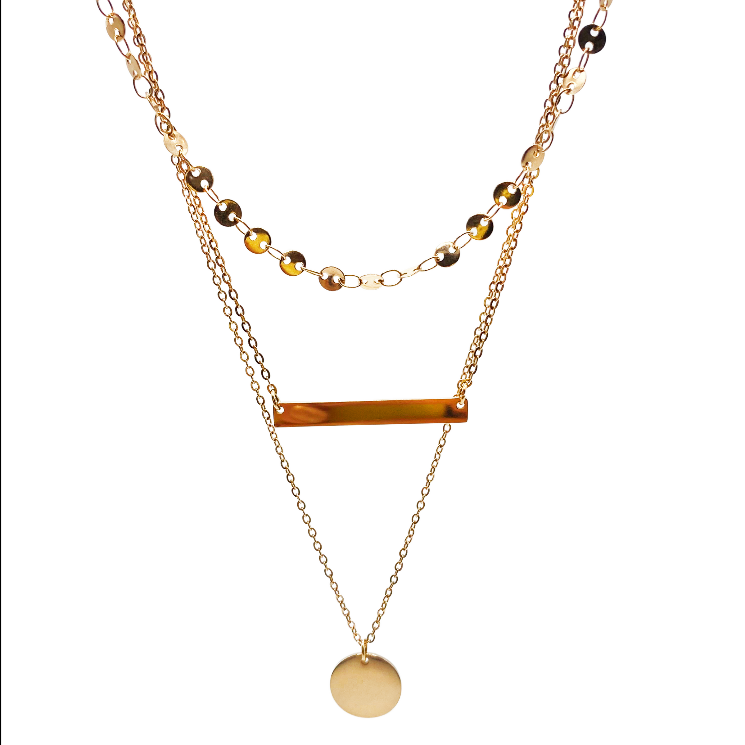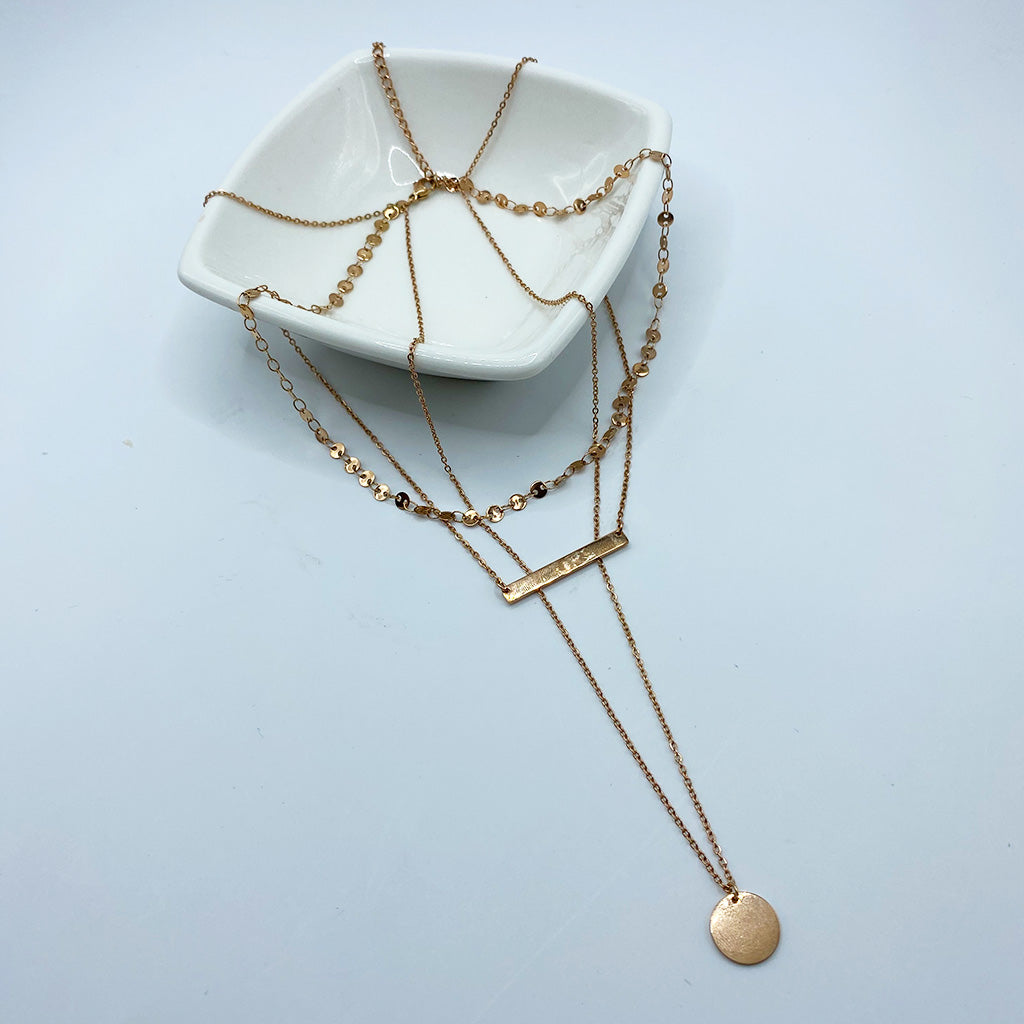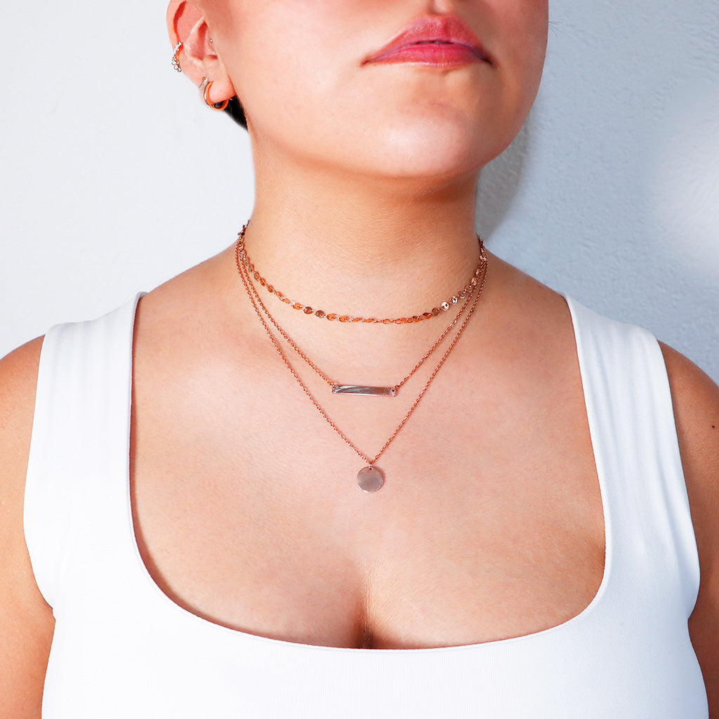 Gargantilla triple (35 cm, 40 cm y 45 cm) en acero rosado y dije de barra y punto.