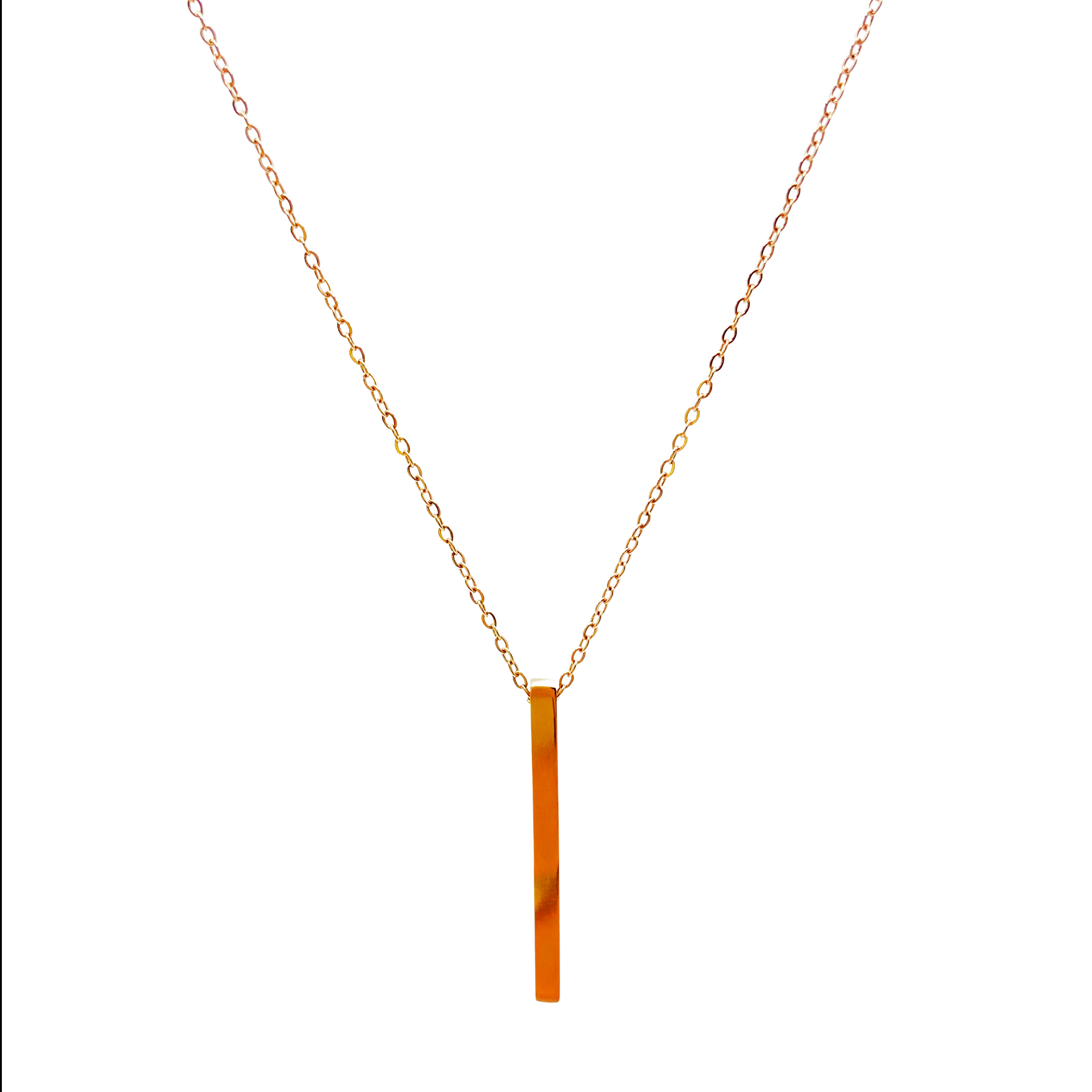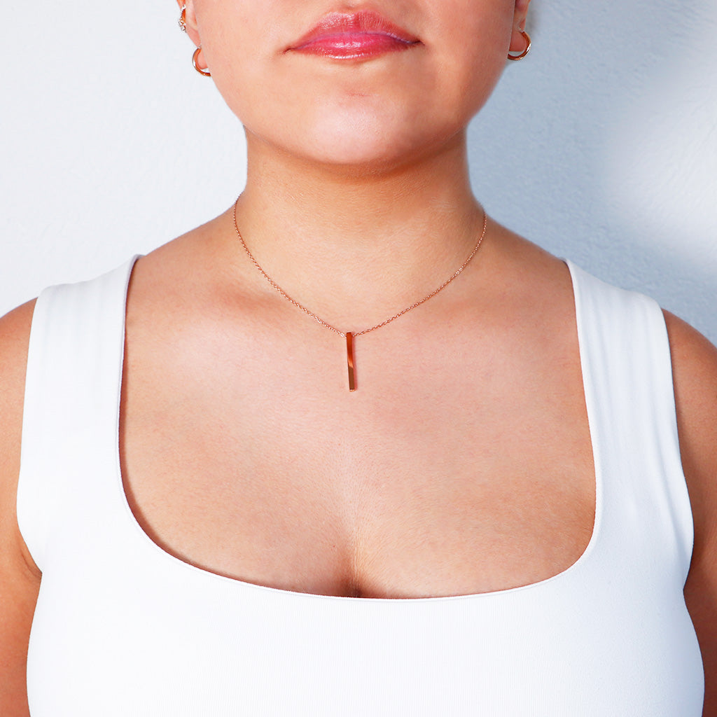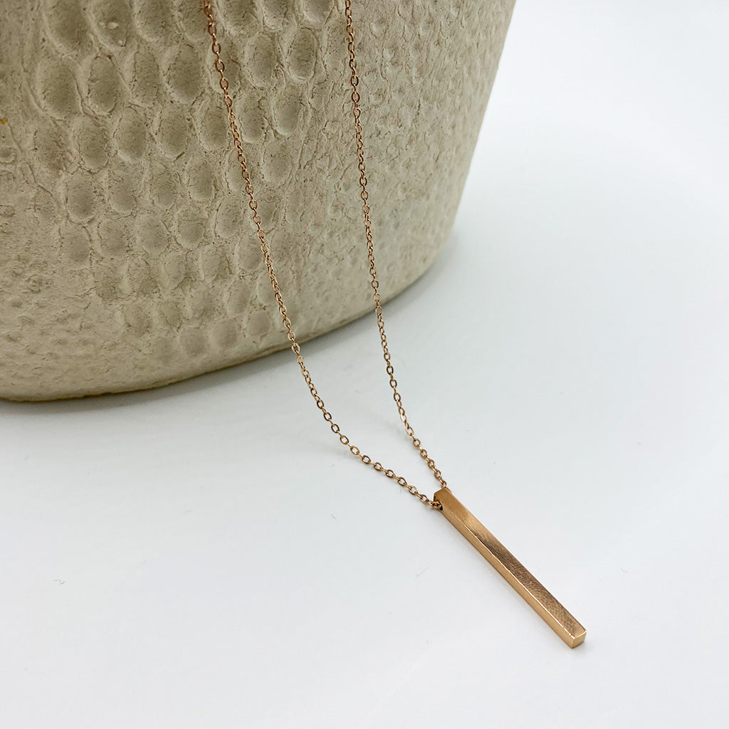 Gargantilla en acero rosado, 45 cm de largo, con dije en forma de lingote.