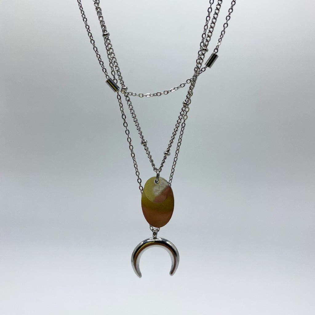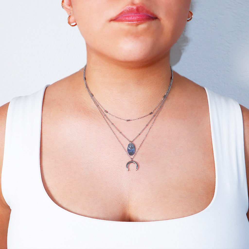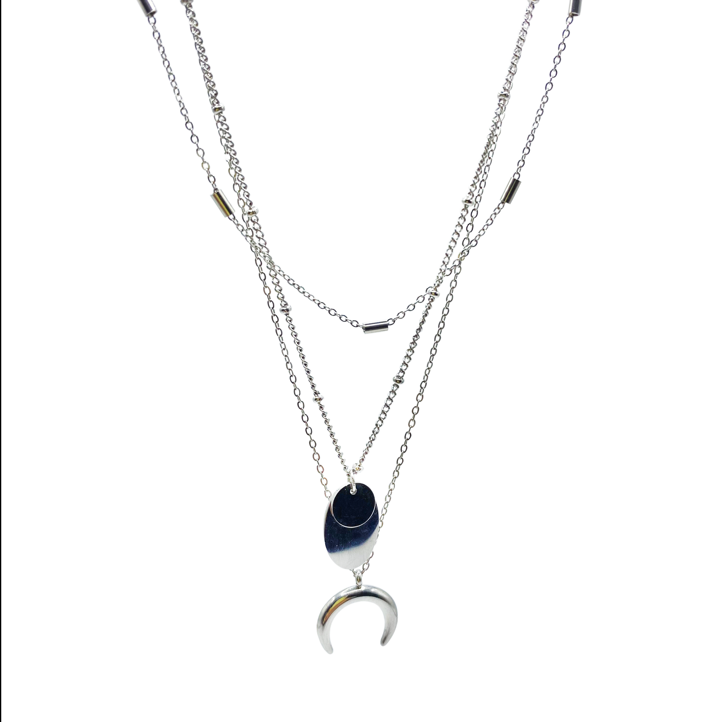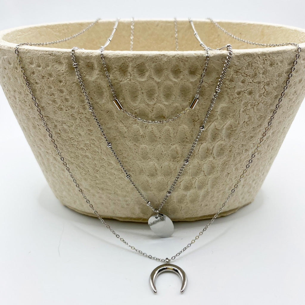 Gargantilla triple en acero plateado (35 cm, 40 cm y 45 cm) con extensión de 5 cm y dije de luna invertida o cuerno.