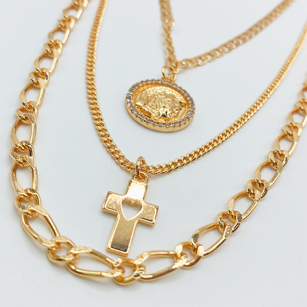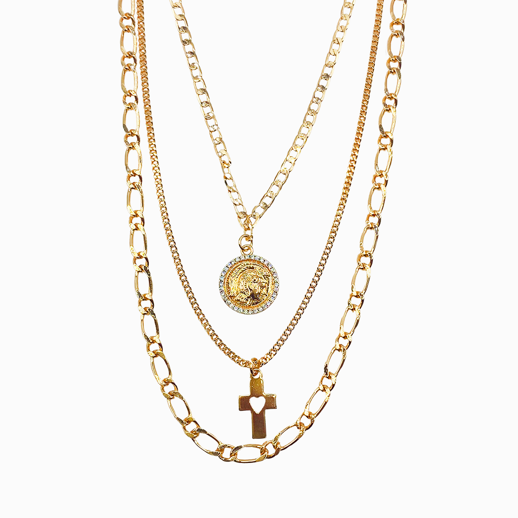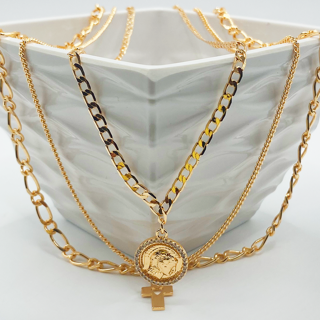 Collar en chapeado en oro de 18k, de tres caidas con dijes de cruz y medalla.