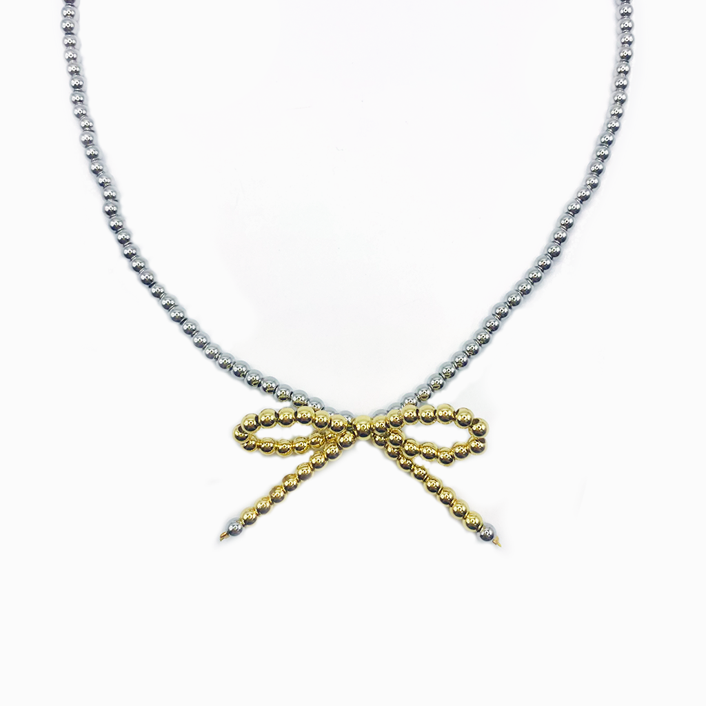 Collar de cuentas metálicas con diseño de lazo dorado y plateado.
