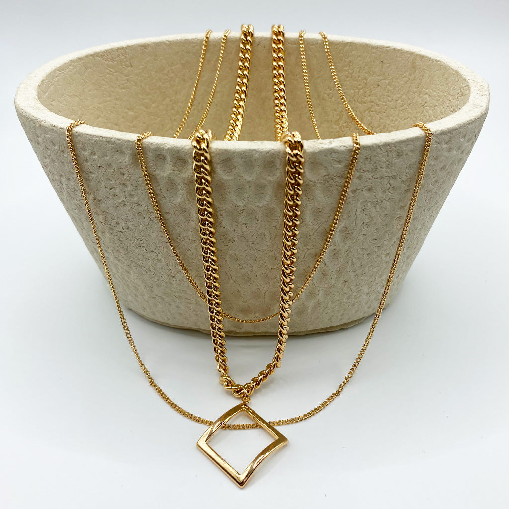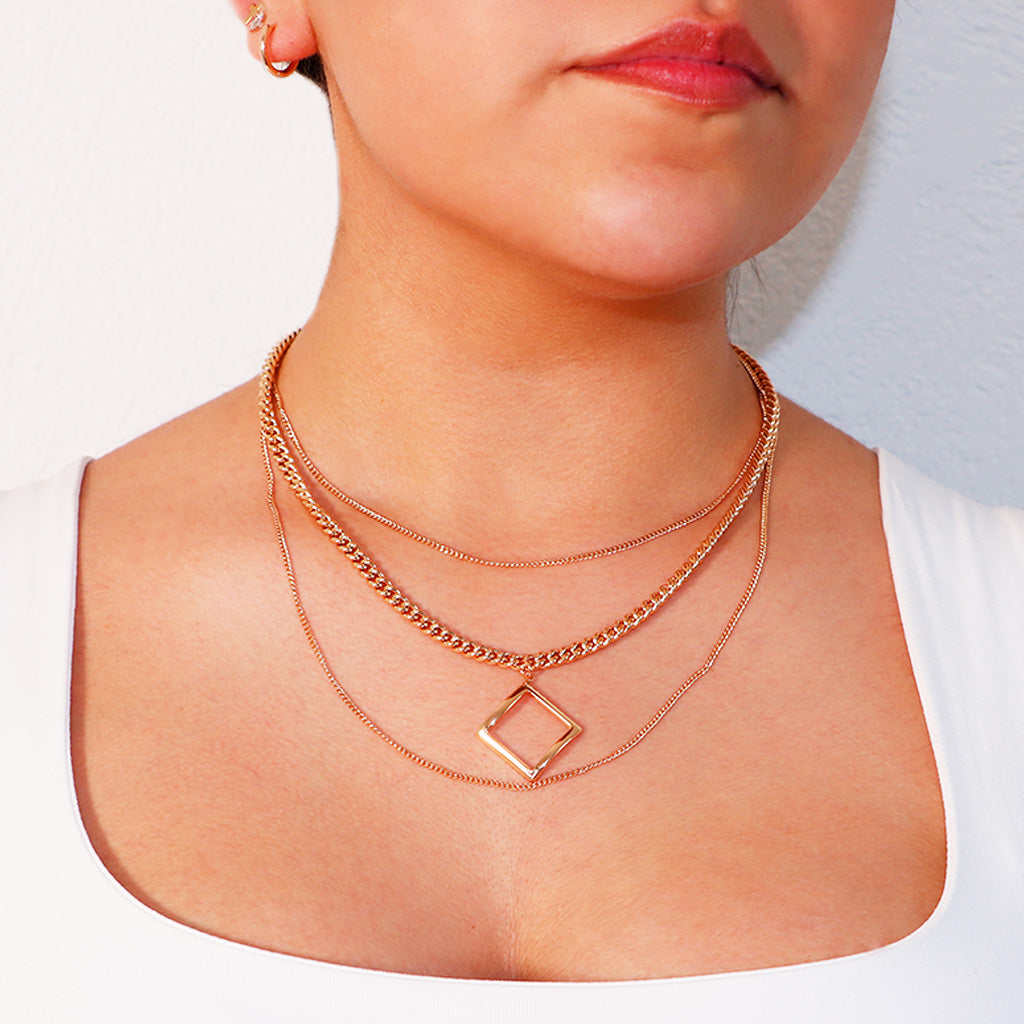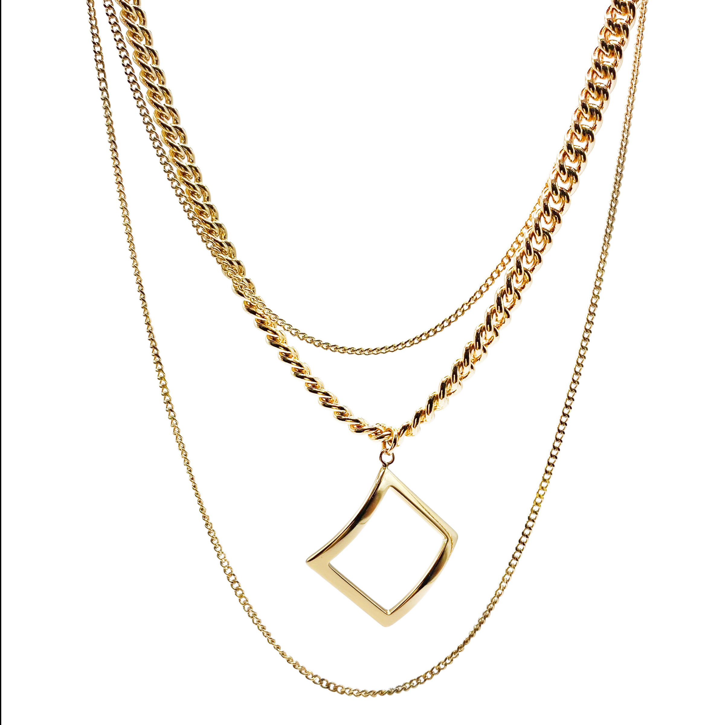 Gargantilla en chapa de oro 18k con dije geométrico, cadenas en 3 bloques (35 cm, 40 cm y 45 cm) y extensión de 5 cm.