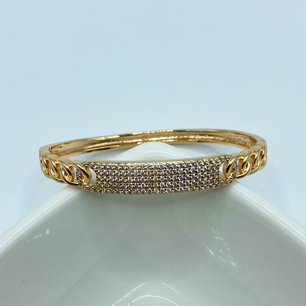 Brazalete en chapa de oro 18k, ovalado con zirconias en su placa, 7 cm de diámetro.
