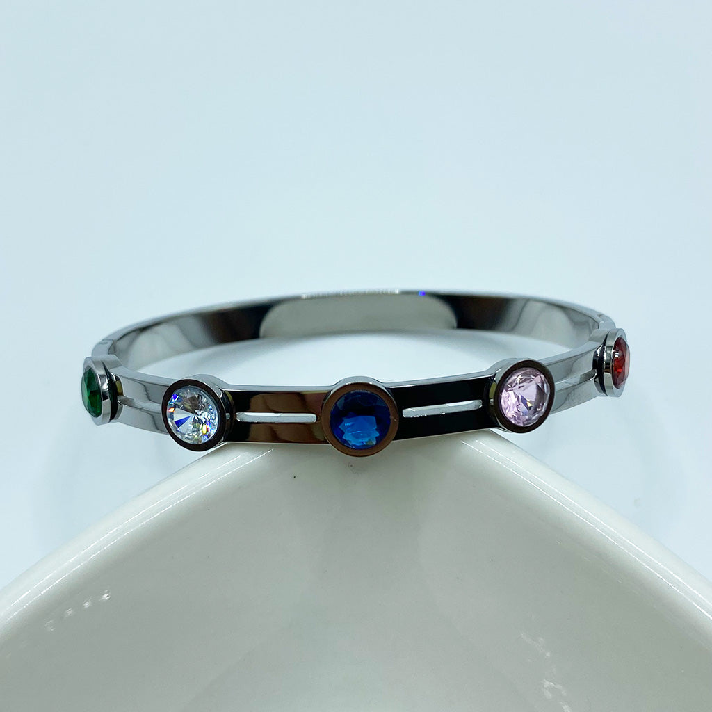 Brazalete de acero plateado, ovalado con zirconias en diferentes tonos, 7 cm de diámetro.