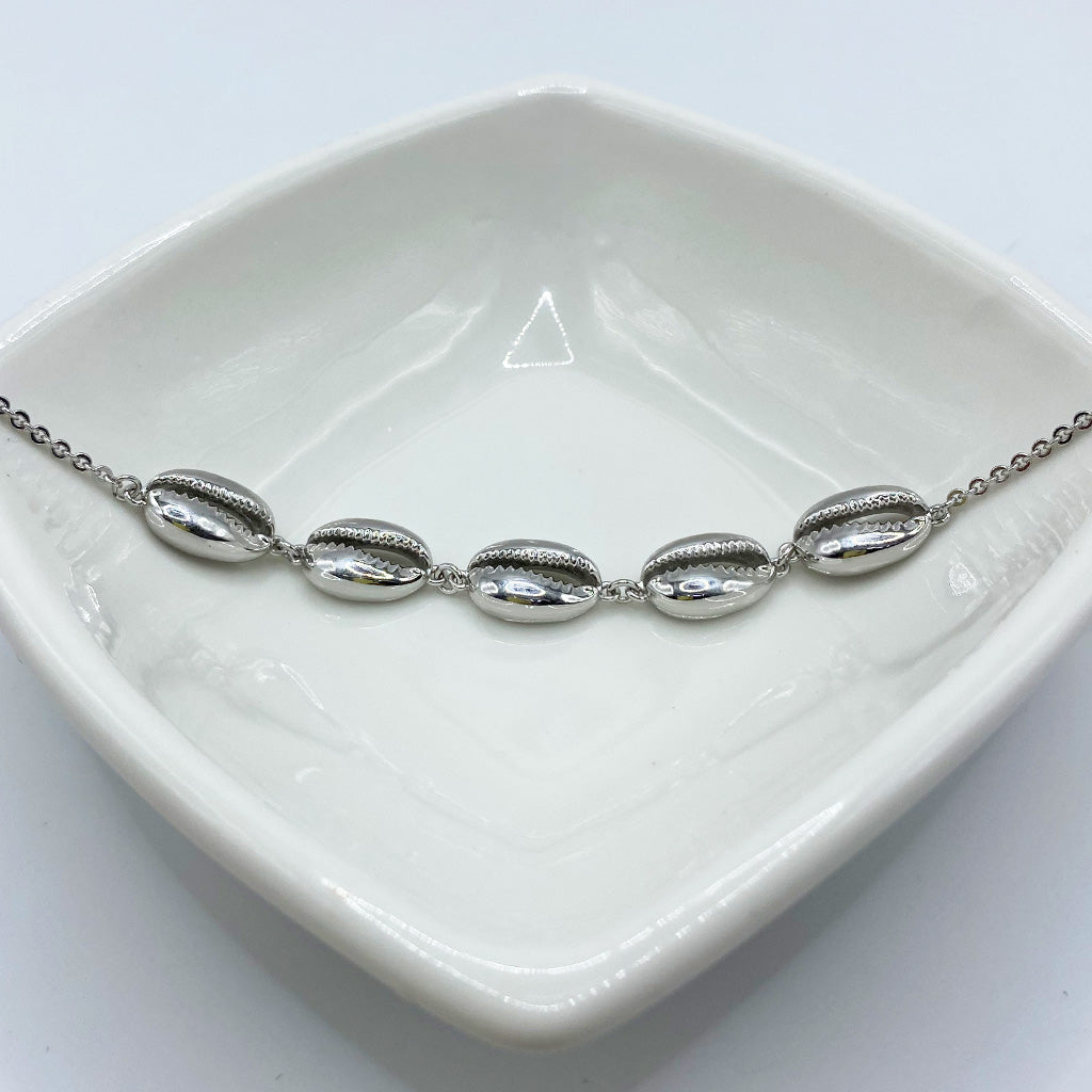 Pulsera en baño de rodio, diseño con conchitas con 19 cm de largo y extensión de 5 cm totalmente lisa.