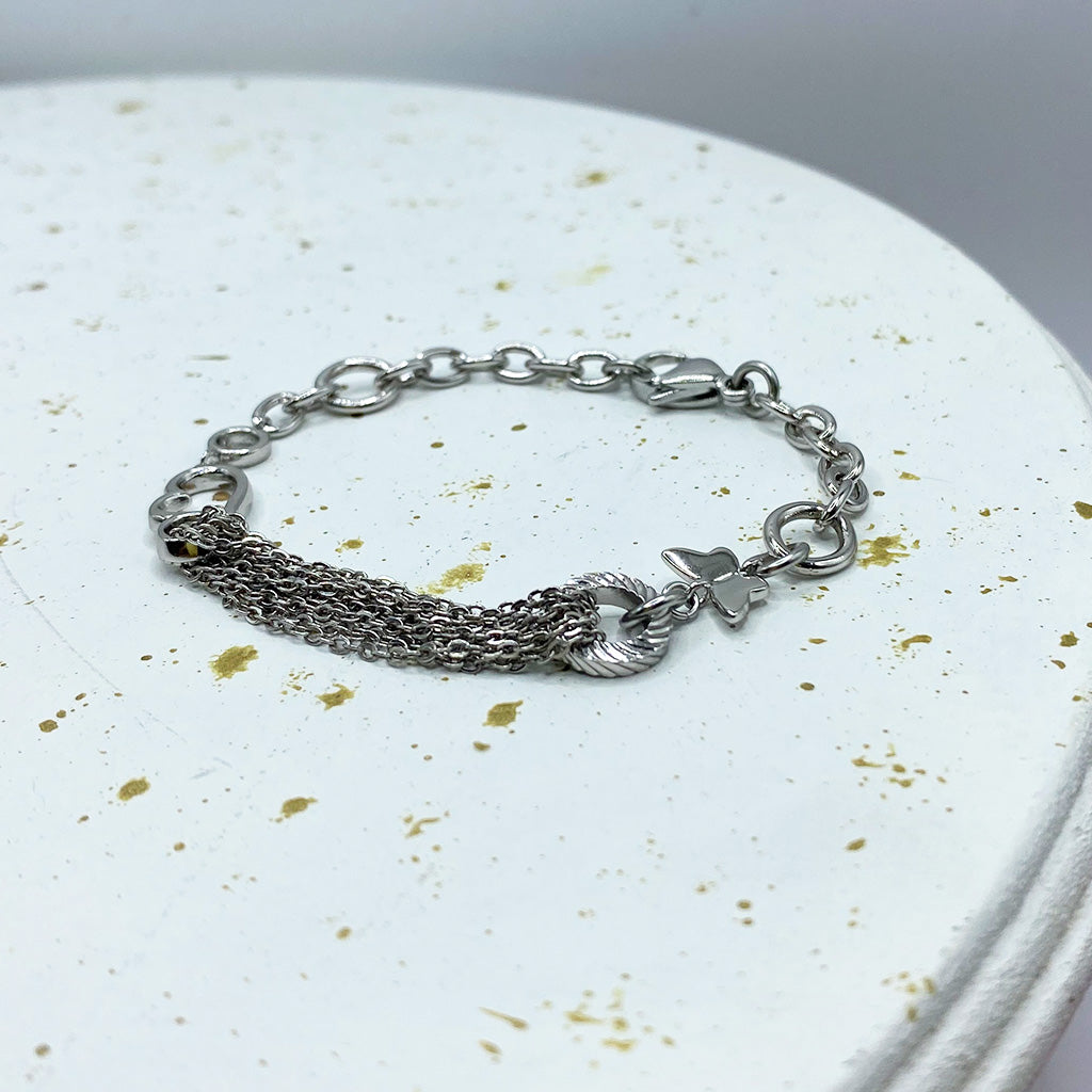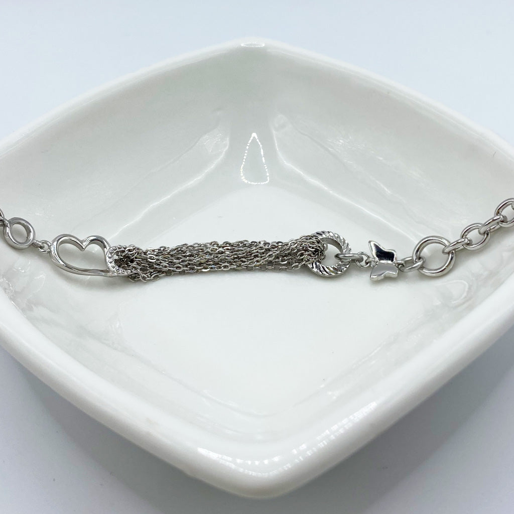 Pulsera en baño de rodio, con dijes en corazón y mariposa con varios hilos y 17 cm de largo.
