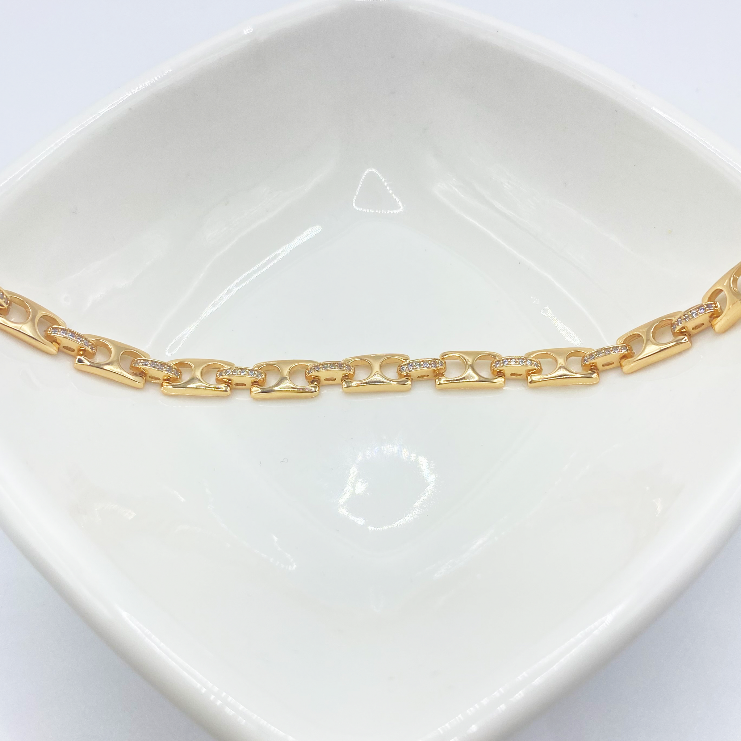 Pulsera con eslabones y anillas con circonias bañada en oro de 18 kilates.