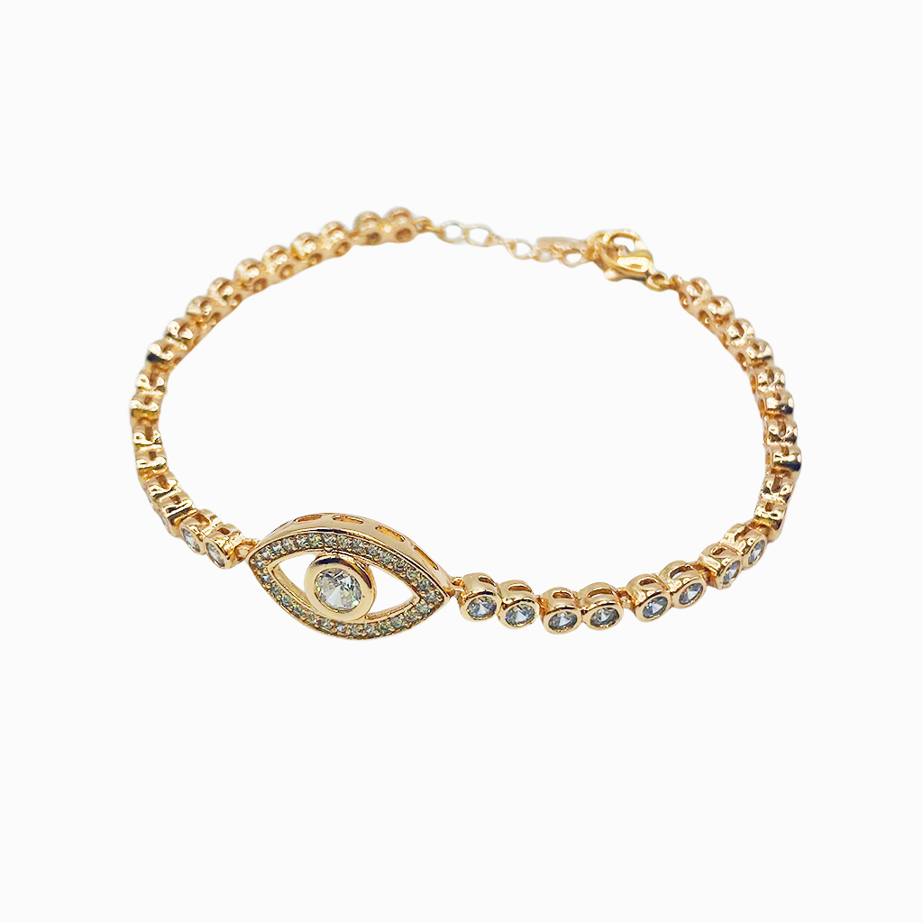 Pulsera bañada en oro con cuentas doradas y dije central en forma de ojo, adornado con circonitas brillantes.