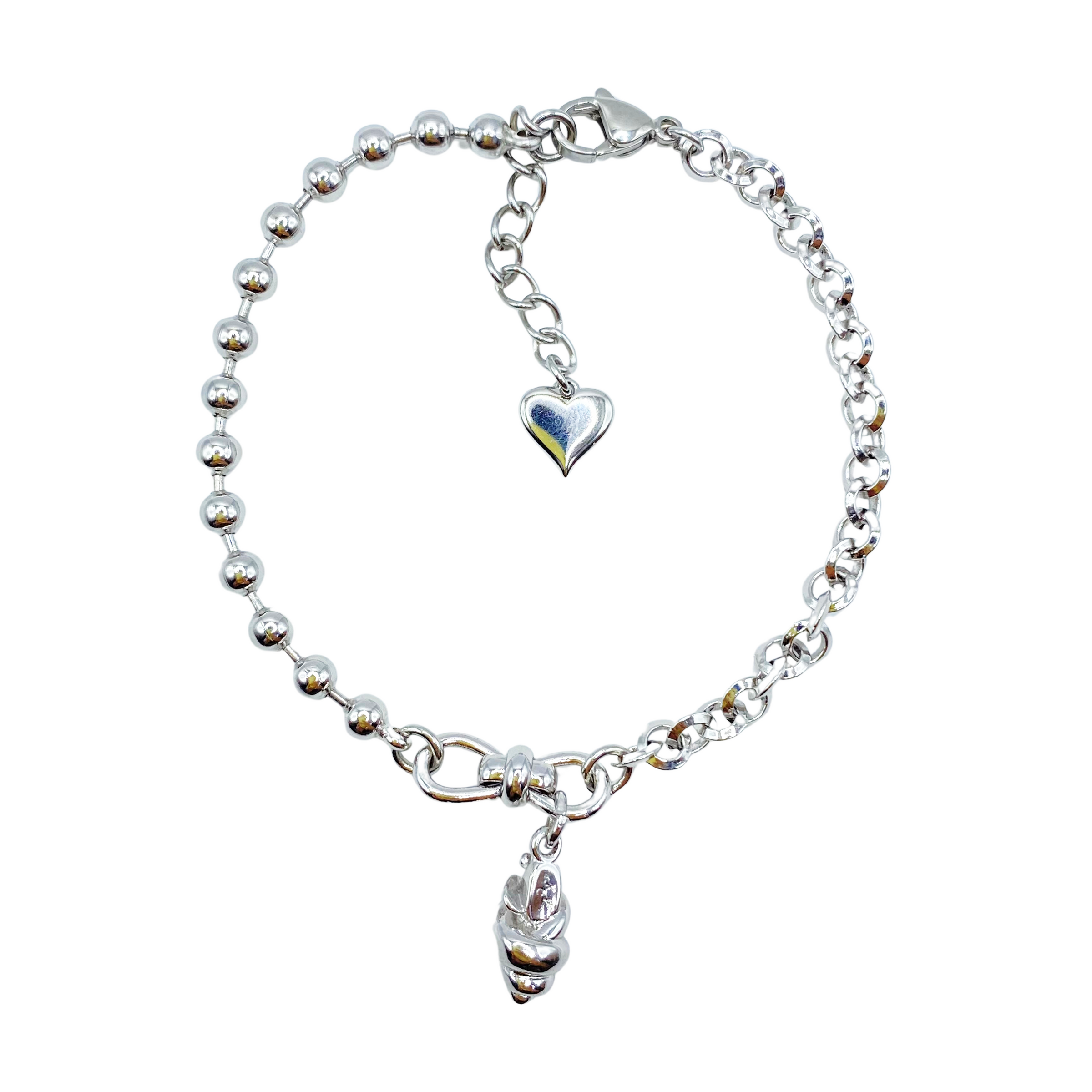 Pulsera de baño de rodio, diseño en perlas plateadas con eslabones y dije de conchita, 21 cm de largo.