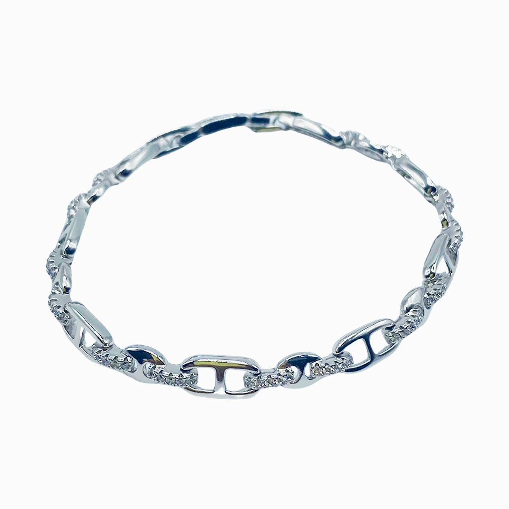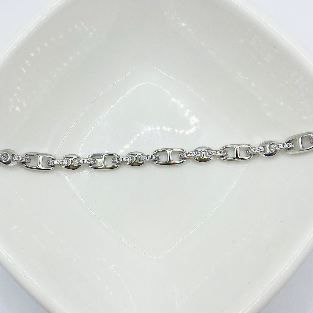 Pulsera de eslabones en plata con detalles brillantes. Su diseño elegante y moderno es perfecto para cualquier ocasión. Longitud ajustable y cierre seguro.