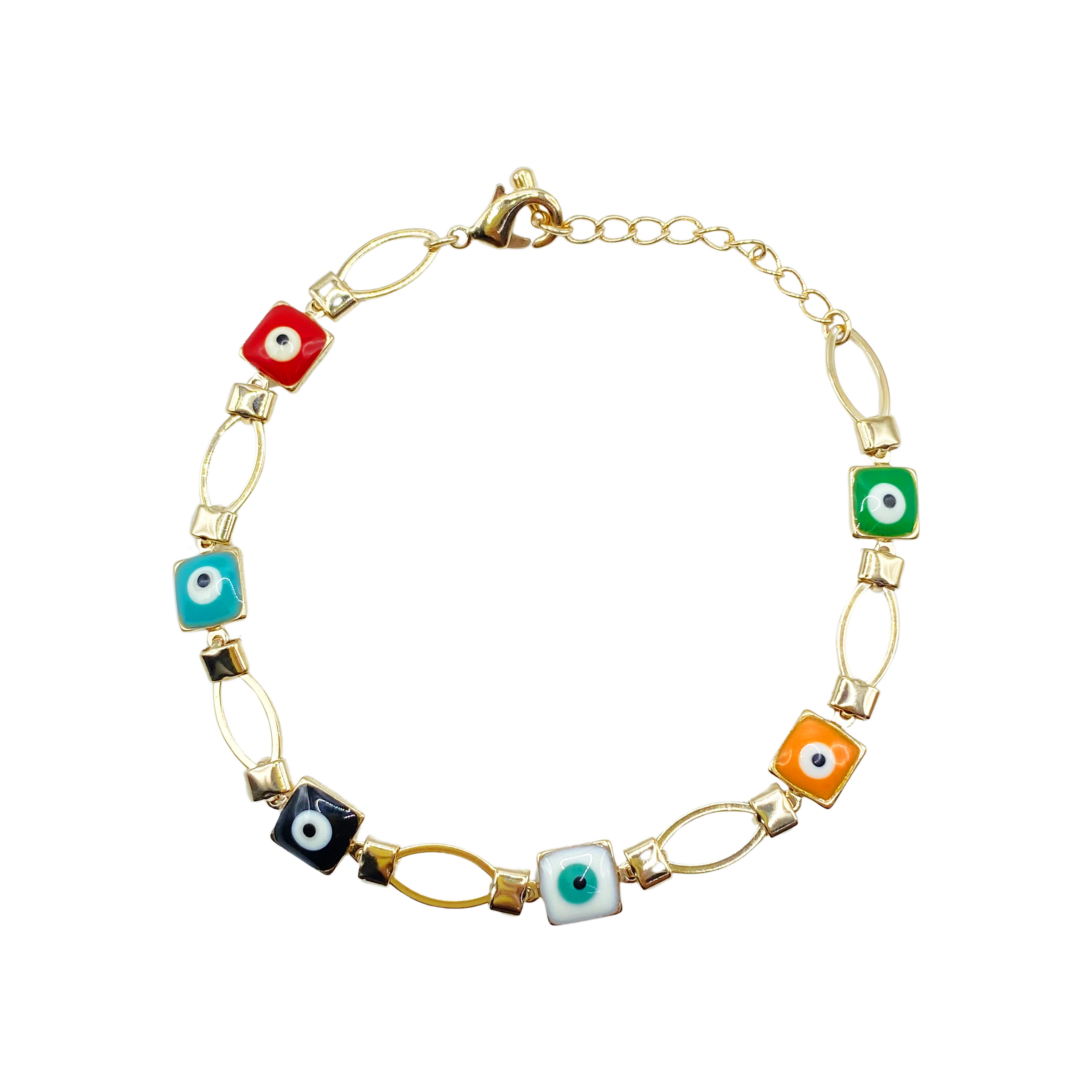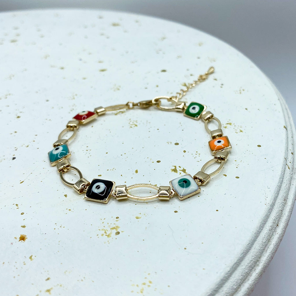 Pulsera de chapa de oro 18k con ojo turco en varios tonos, 18 cm de largo y una extensión de 5 cm.