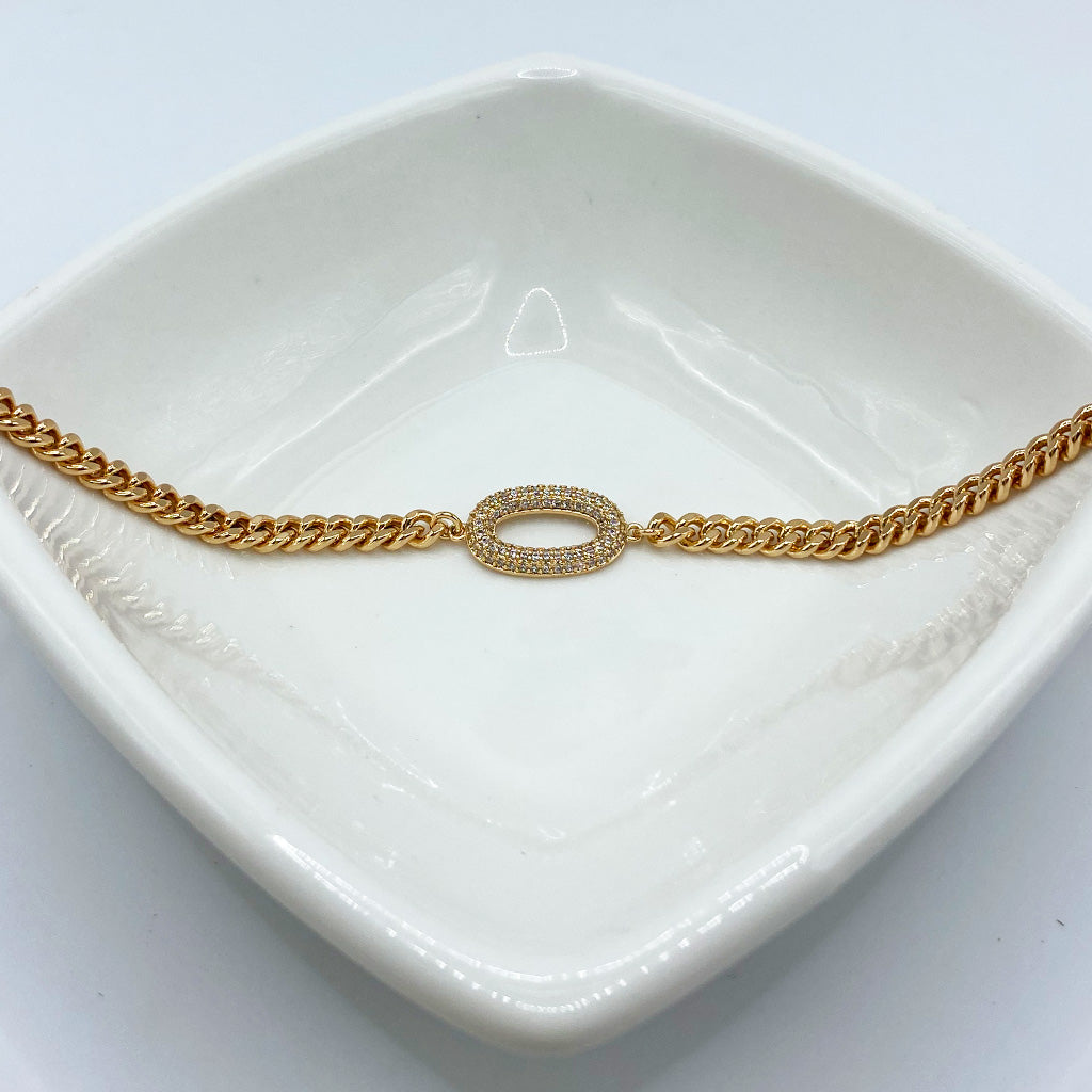 Pulsera en chapa de oro 18k con eslabones cubanos y dije oval cubierto de micro zirconias, 17 cm de largo y extensión de 5 cm.