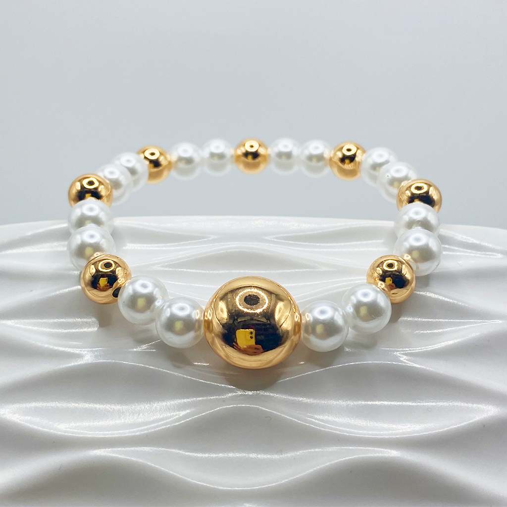 Pulsera elástica compuesta por perlas sintéticas blancas y esferas metálicas doradas de acabado brillante. Su diseño combina cuentas redondas y un detalle central ovalado en dorado que aporta un toque distintivo. Ligera y fácil de usar, es ideal para quienes buscan un accesorio elegante y práctico.