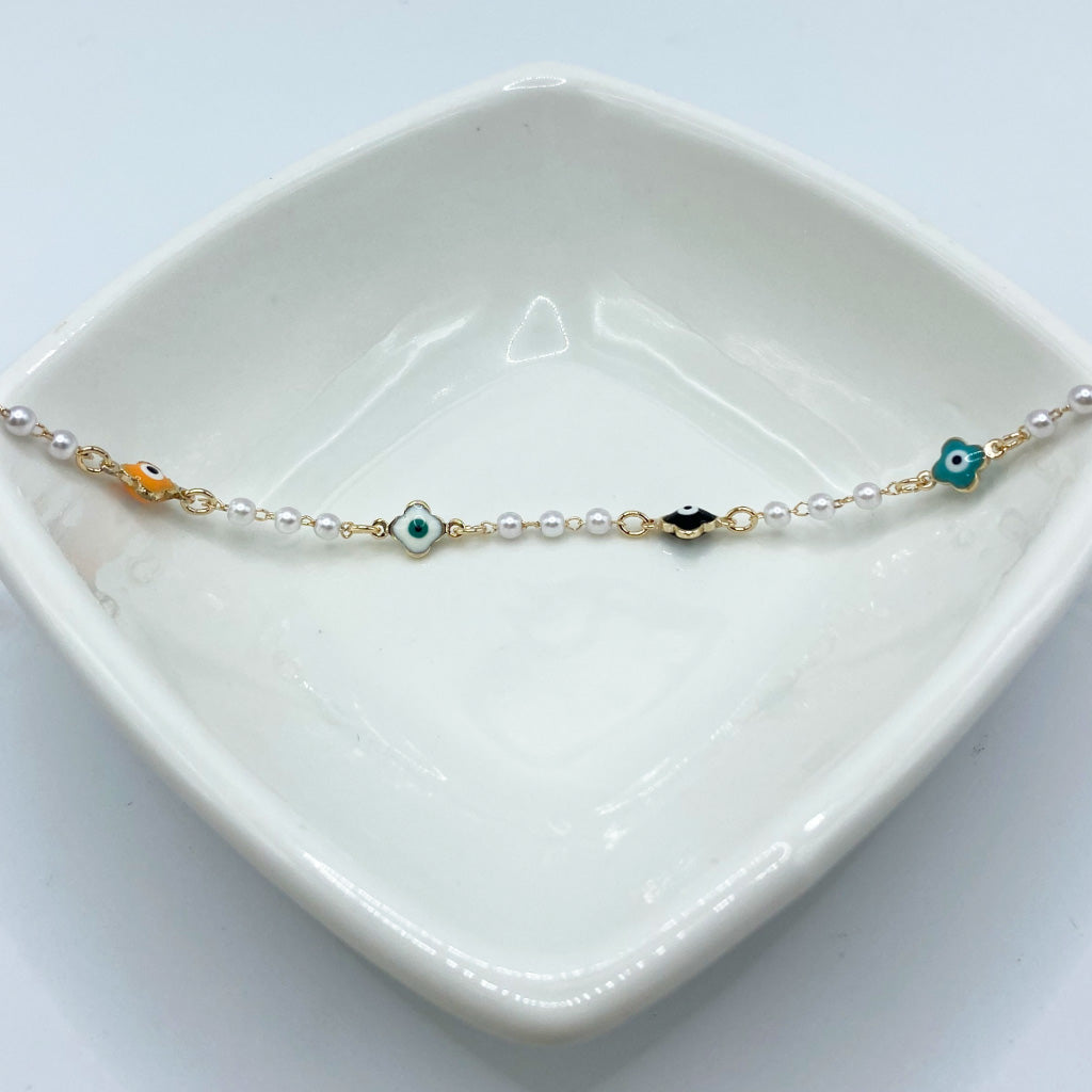Pulsera en chapa de oro 18k, con diseño en perlas y ojo turco en varios tonos, 17 cm de largo y extensión de 5 cm.