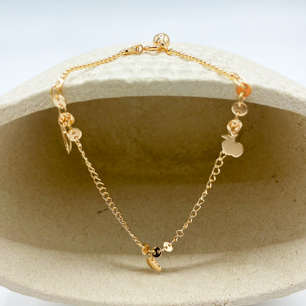 Tobillera lisa con dijes de corazón colgantes y un pequeño cascabel al final, 25 cm de largo, chapa de oro 18k.