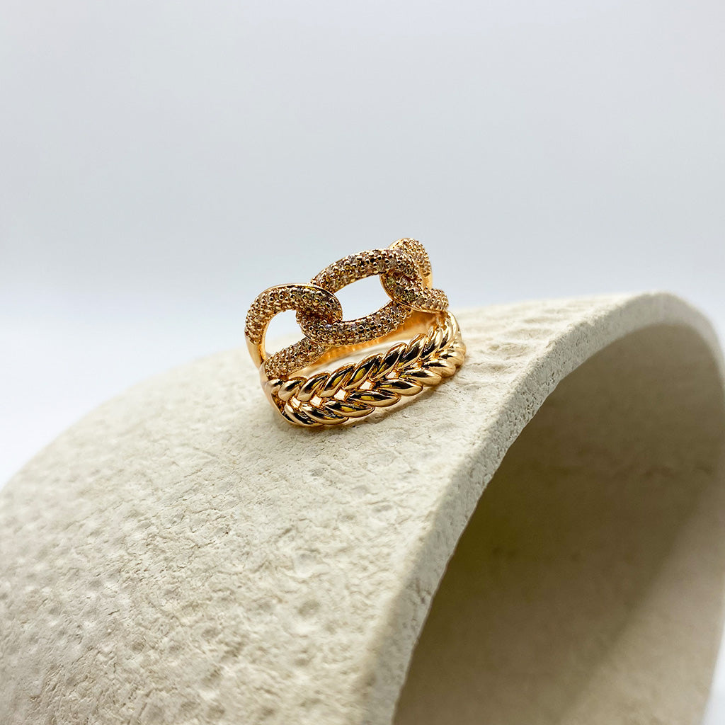 Anillo en chapa de oro 18k, con diseño de eslabone con microzirconias.