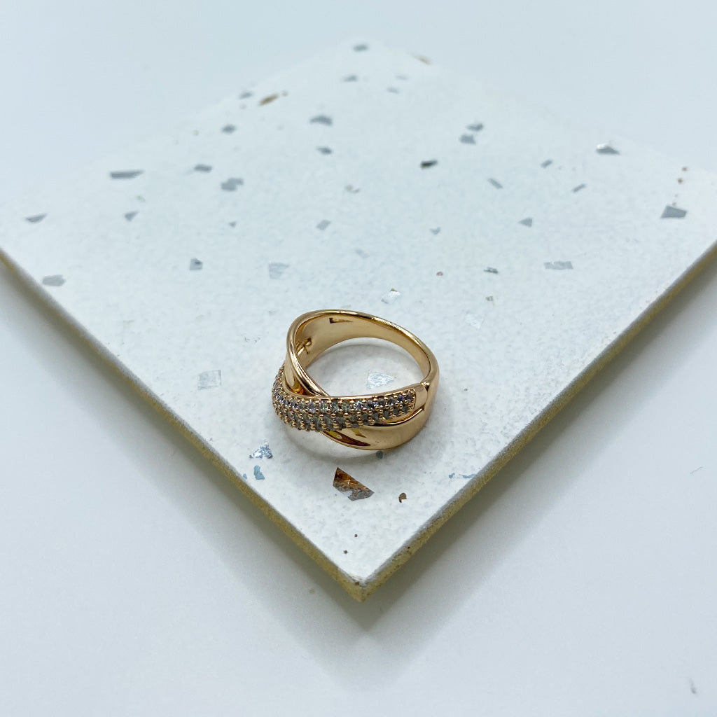 Anillo en chapa de oro 18k de 2 hilos entrelazados con circonitas.