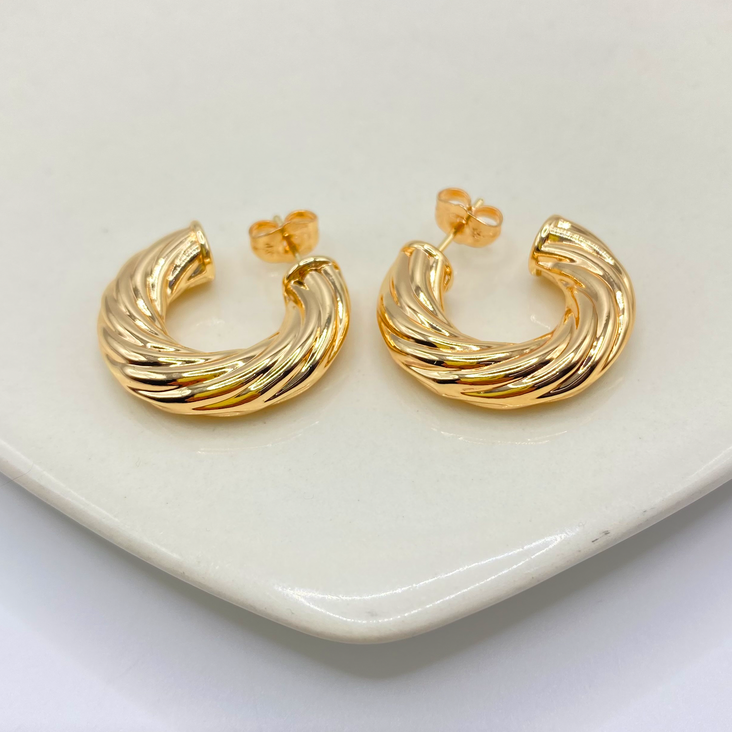 Arracada en chapa de oro 18k, con un diseño con líneas cruzadas y 2,5 cm de diámetro.