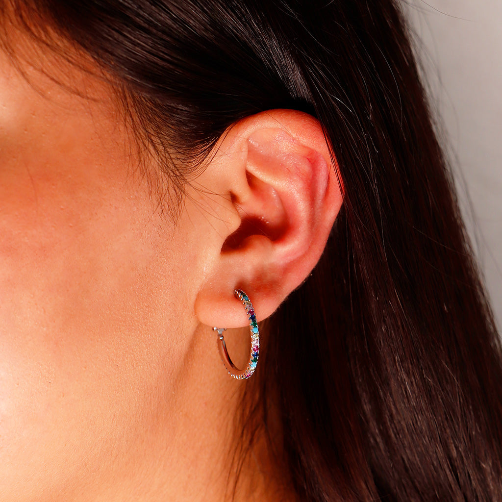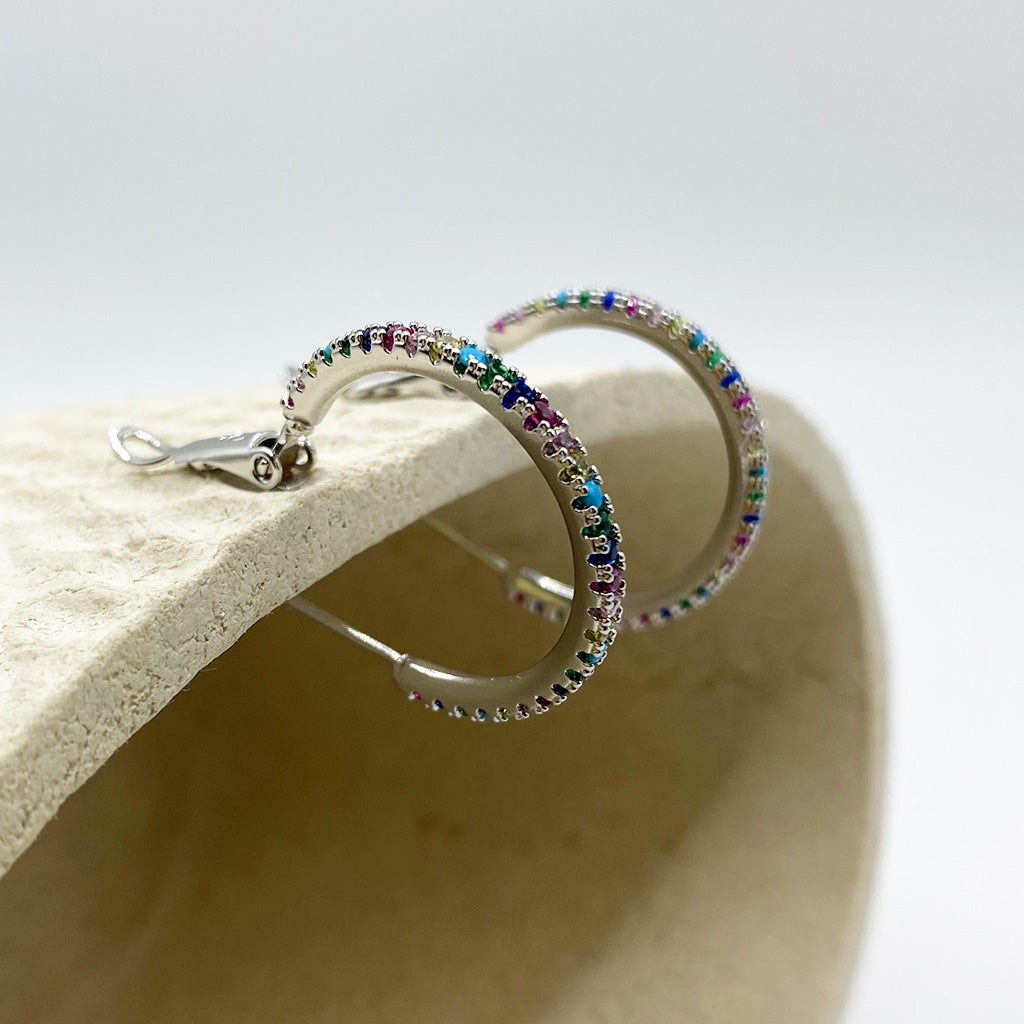 Arracada en baño de rodio con 2 cm de diámetro, cubierta por zirconias en tonos cálidos.