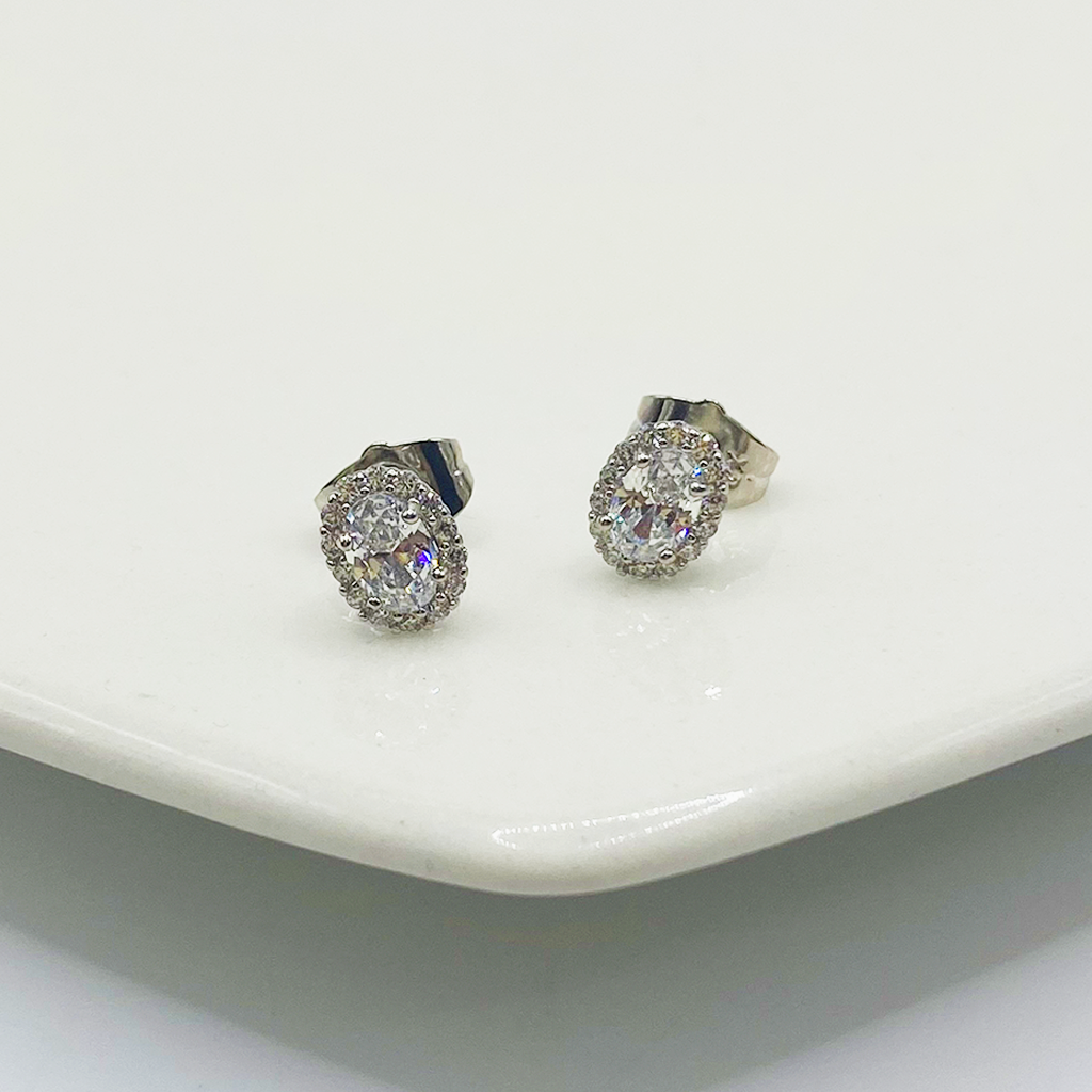 Broquel plateado de circonia con un diseño ovalado, rodeados de brillantes que capturan la luz.