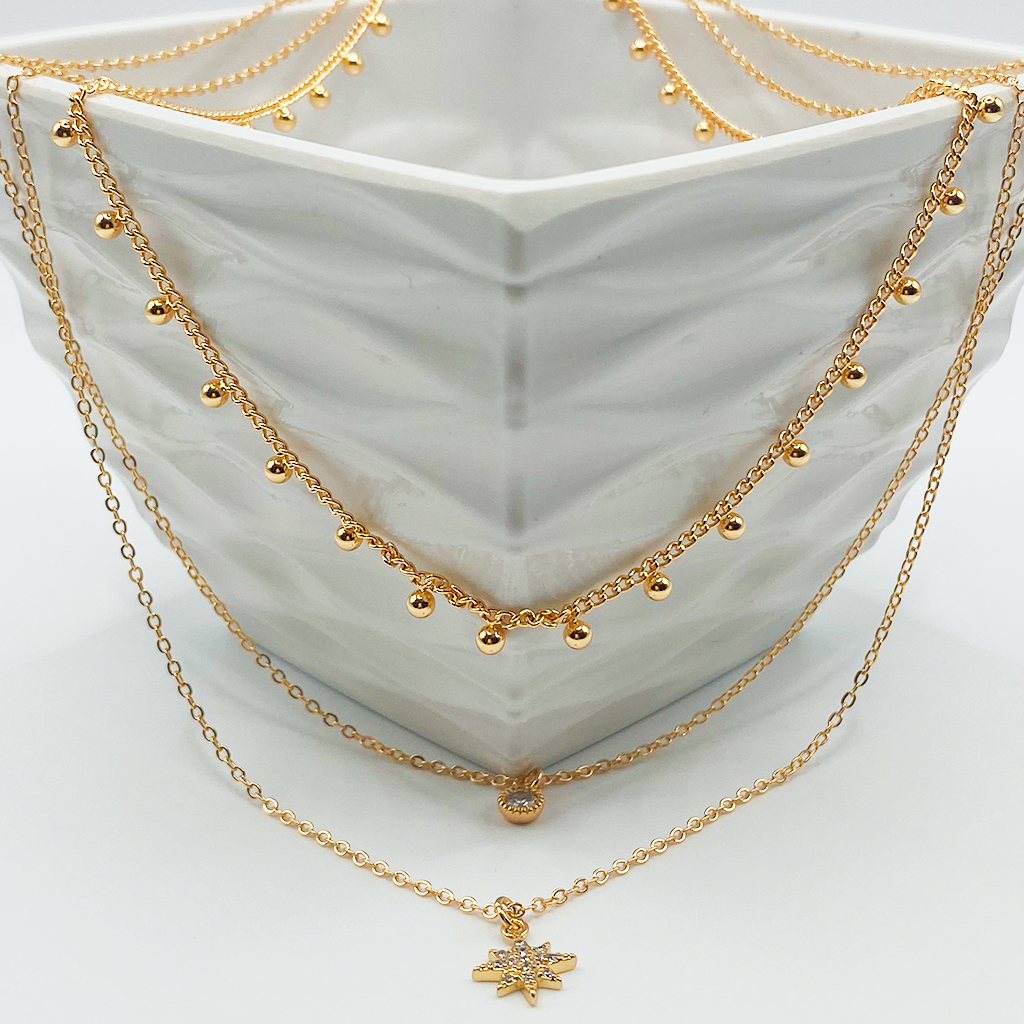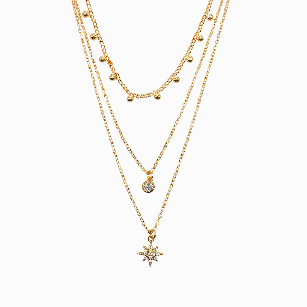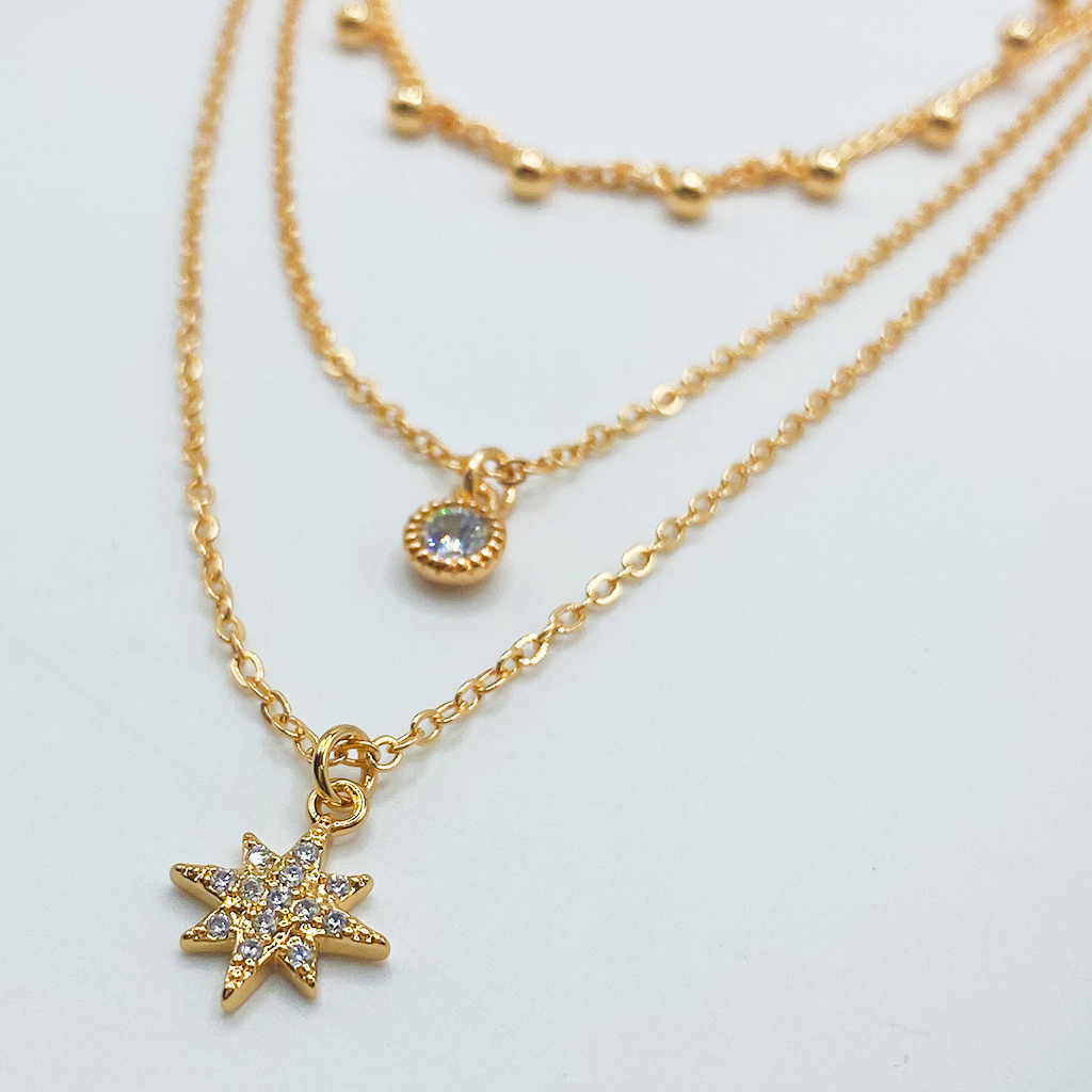 Collar dorado de tres capas con detalles esféricos y colgantes de circonia en forma de estrella y círculo.