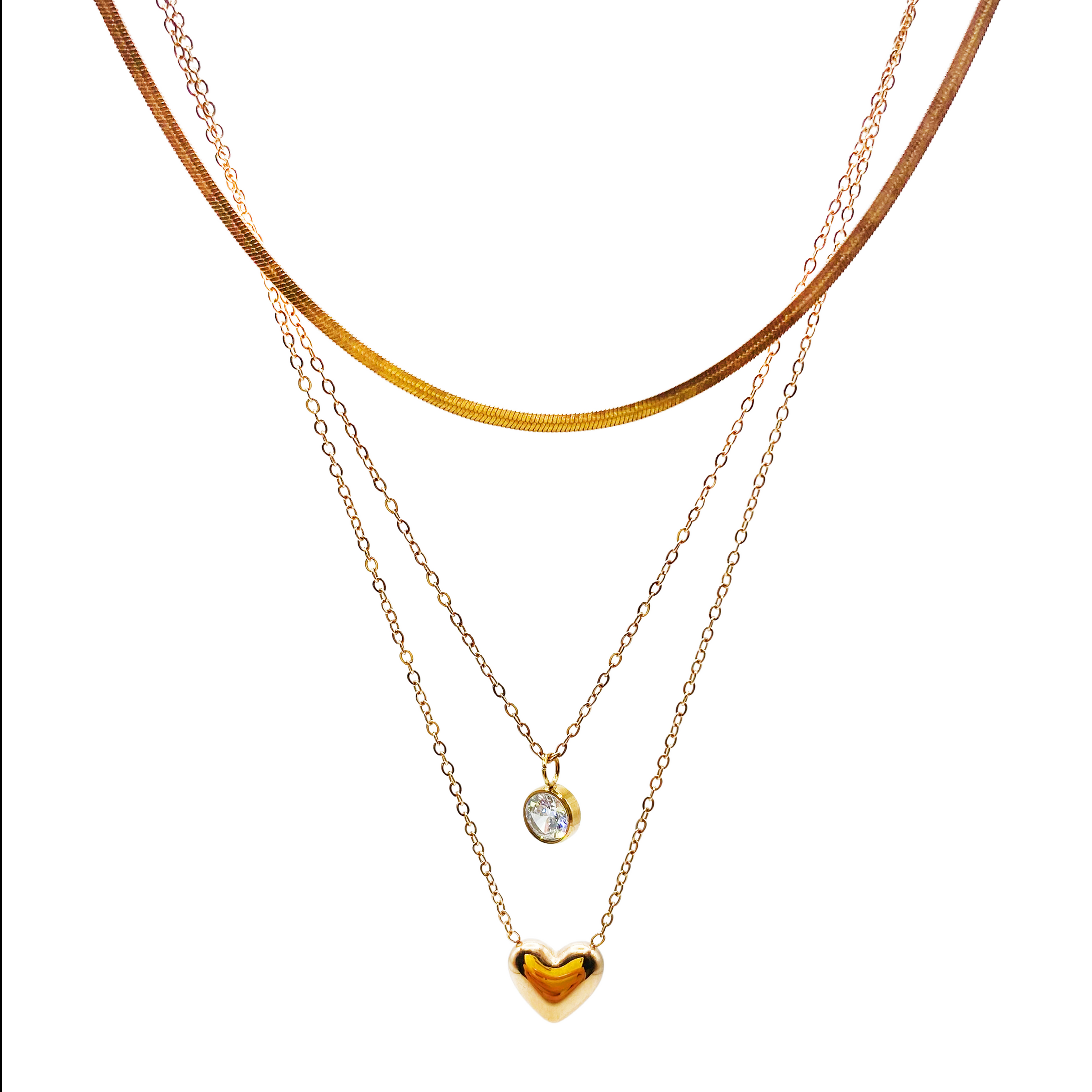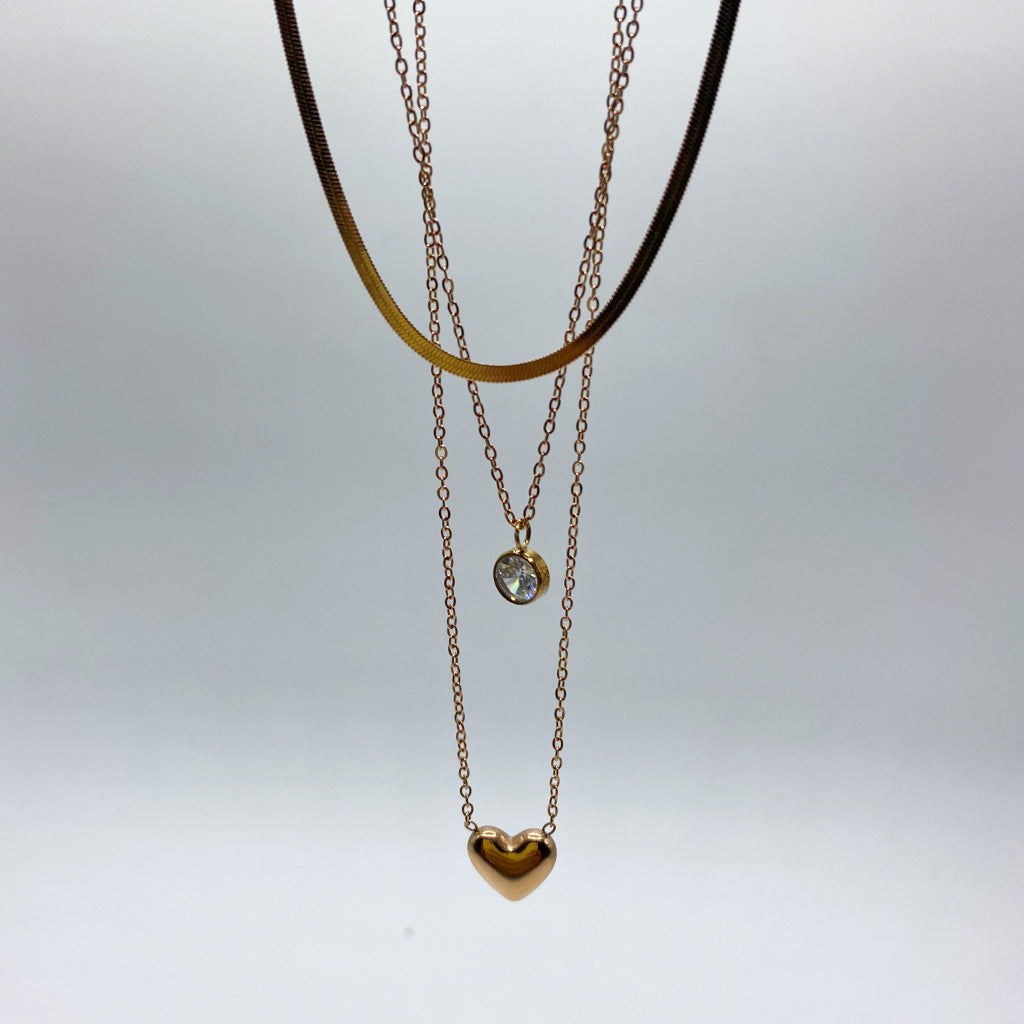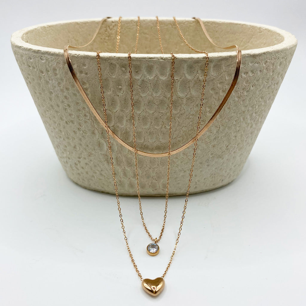 Gargantilla en acero rosado de 3 caídas, (35 cm,40 cm y 45 cm) con extensión de 5 cm y dije de corazón y zirconia.