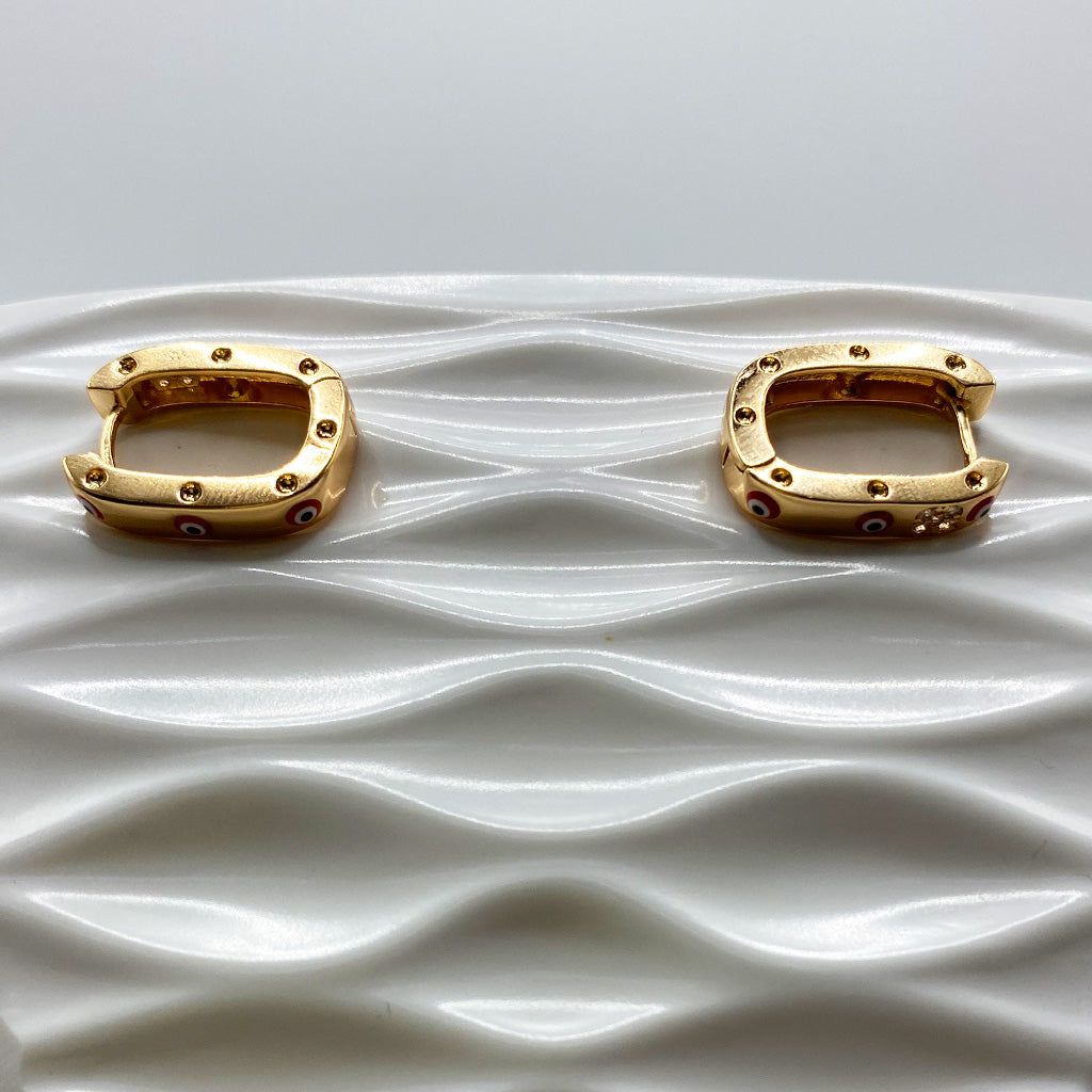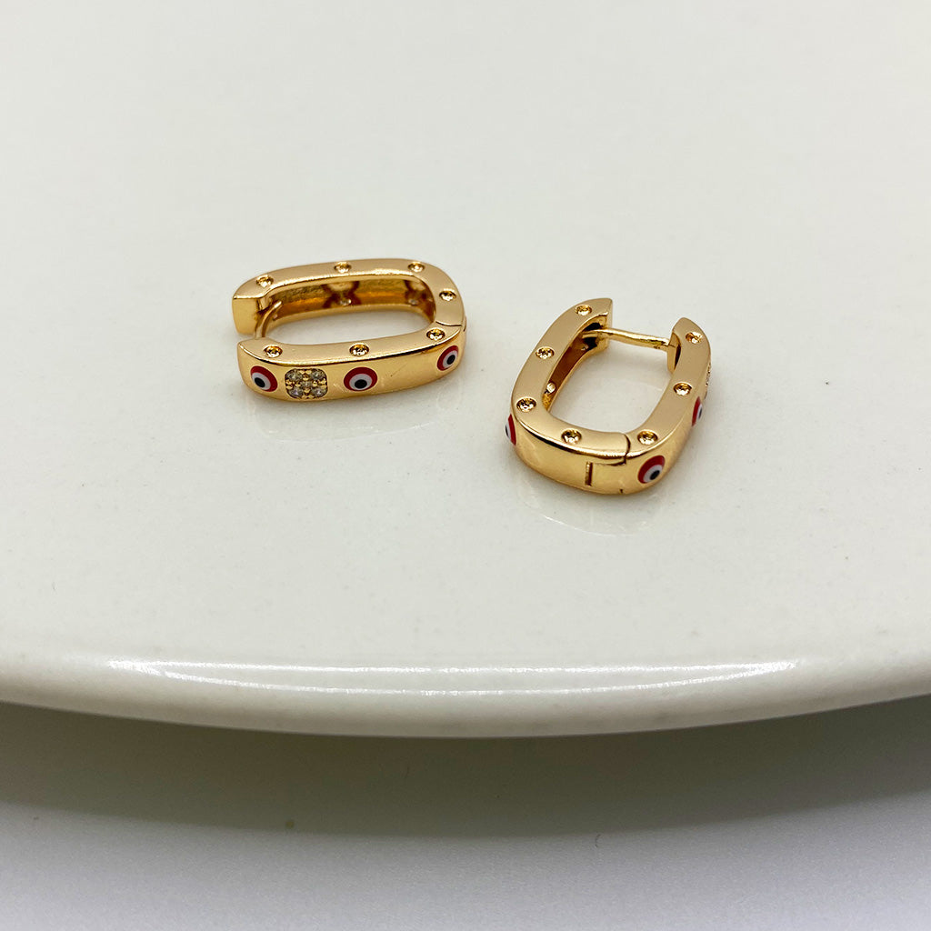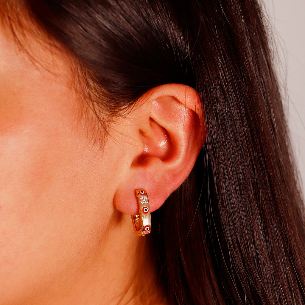 Huggie chapa de oro 18k, 2 cm de largo, diseño de herradura con ojo turco en color rojo.