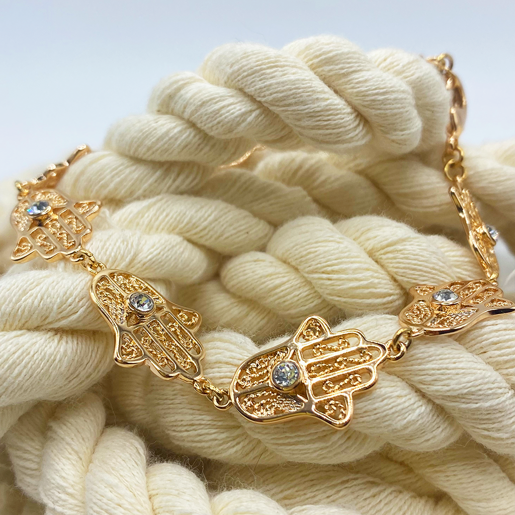 Pulsera dorada con dijes de la Mano de Fátima y circonias incrustradas.