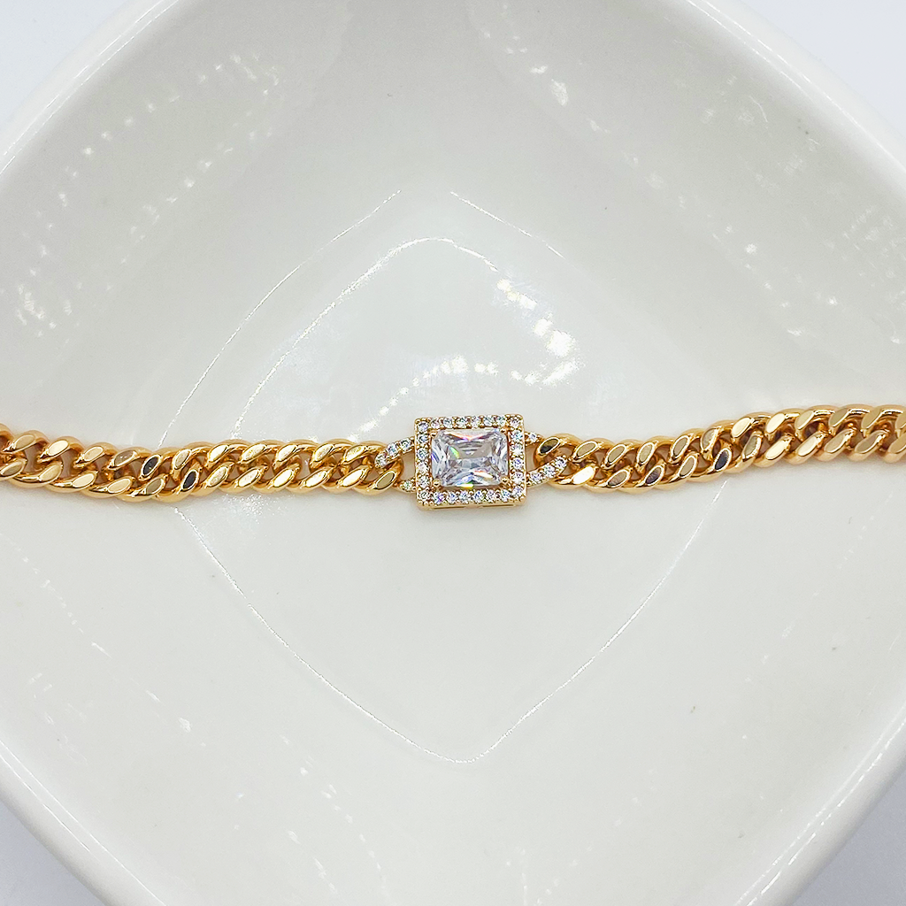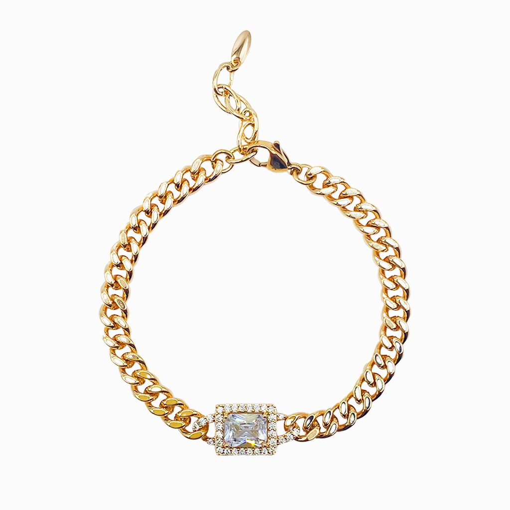 Pulsera con cadena cubana en oro y un cristal rectangular que captura la luz. Un accesorio imprescindible para lucir radiante en cualquier ocasión.