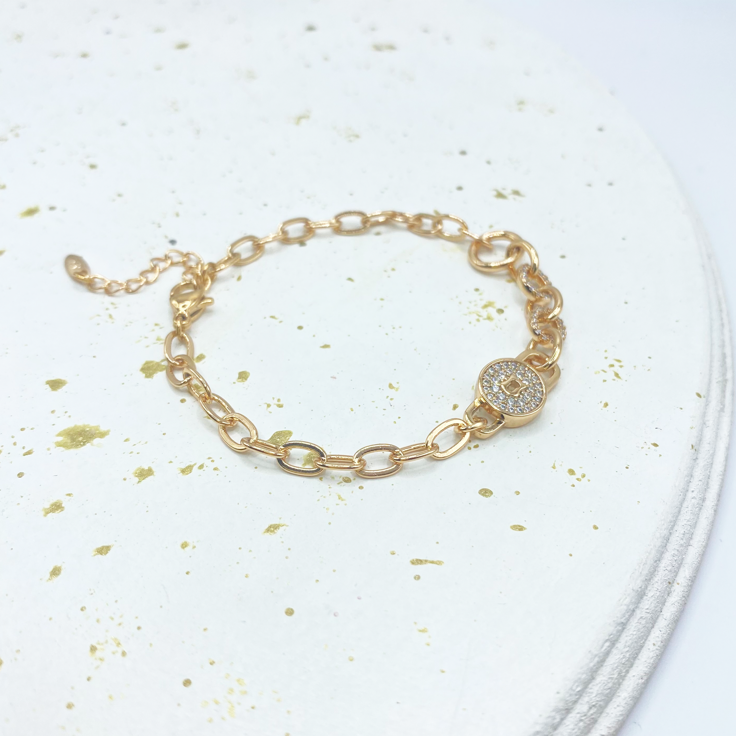 Pulsera de anillas, bañada en oro de 18 kilates con un dije de candado decorado con circonias.